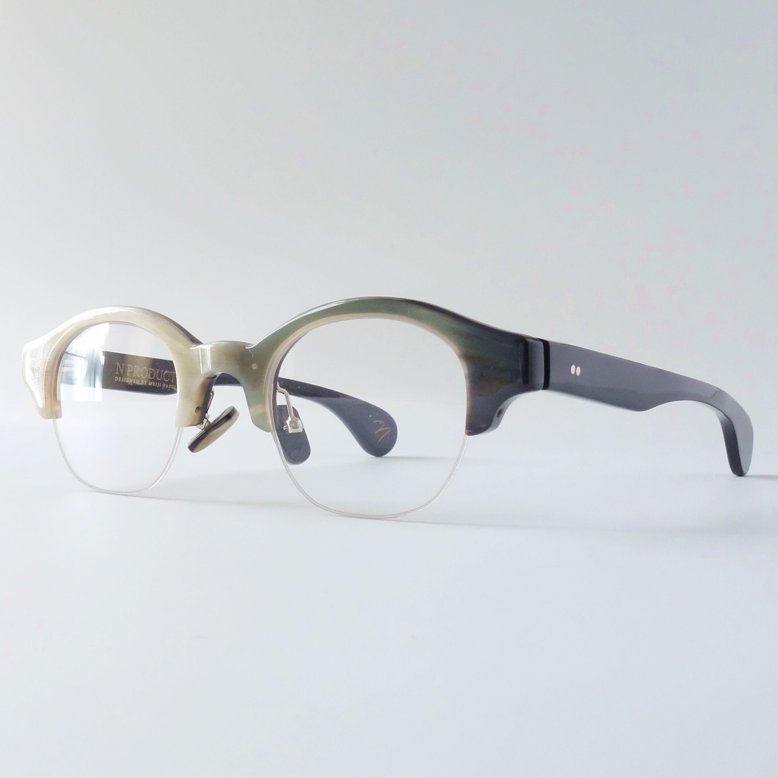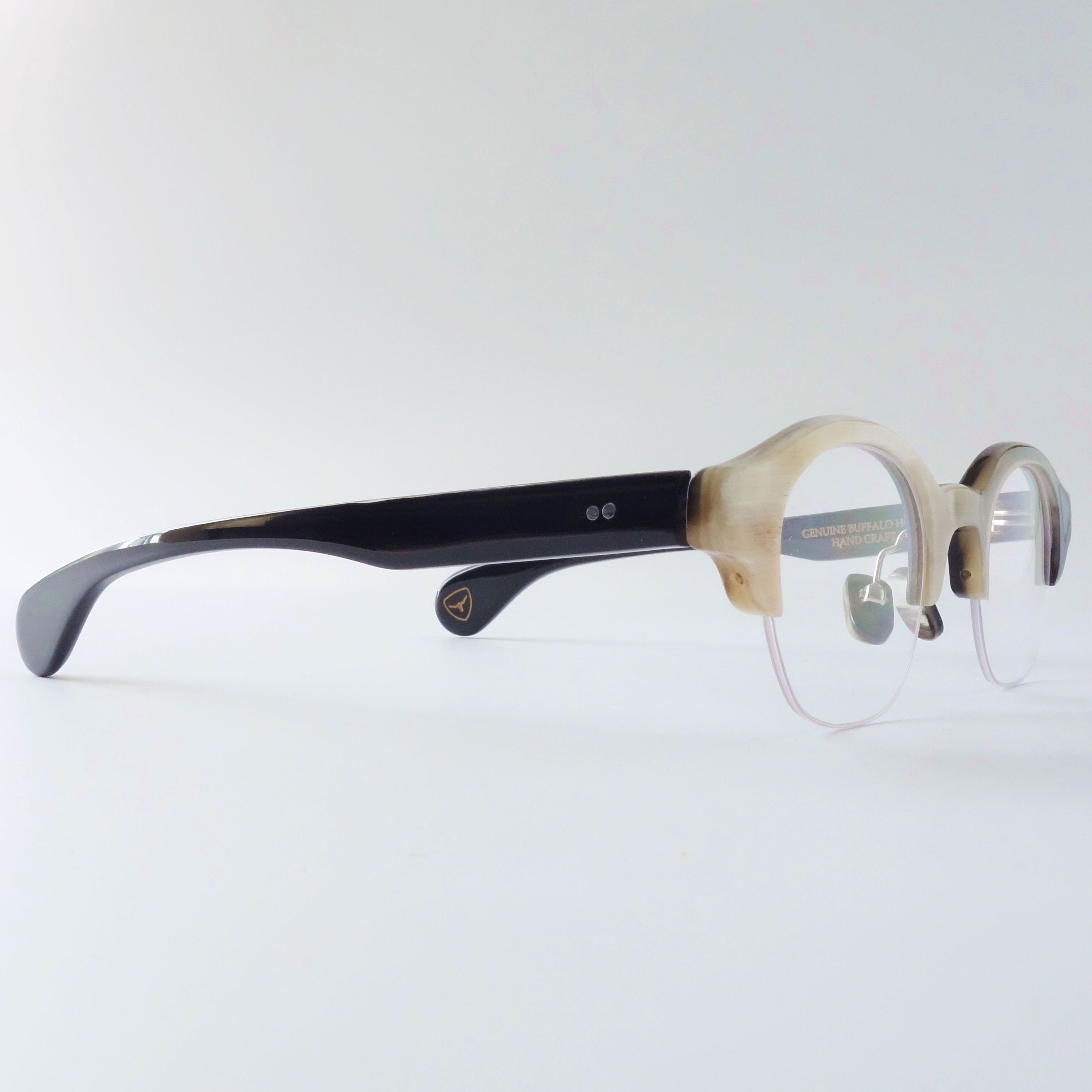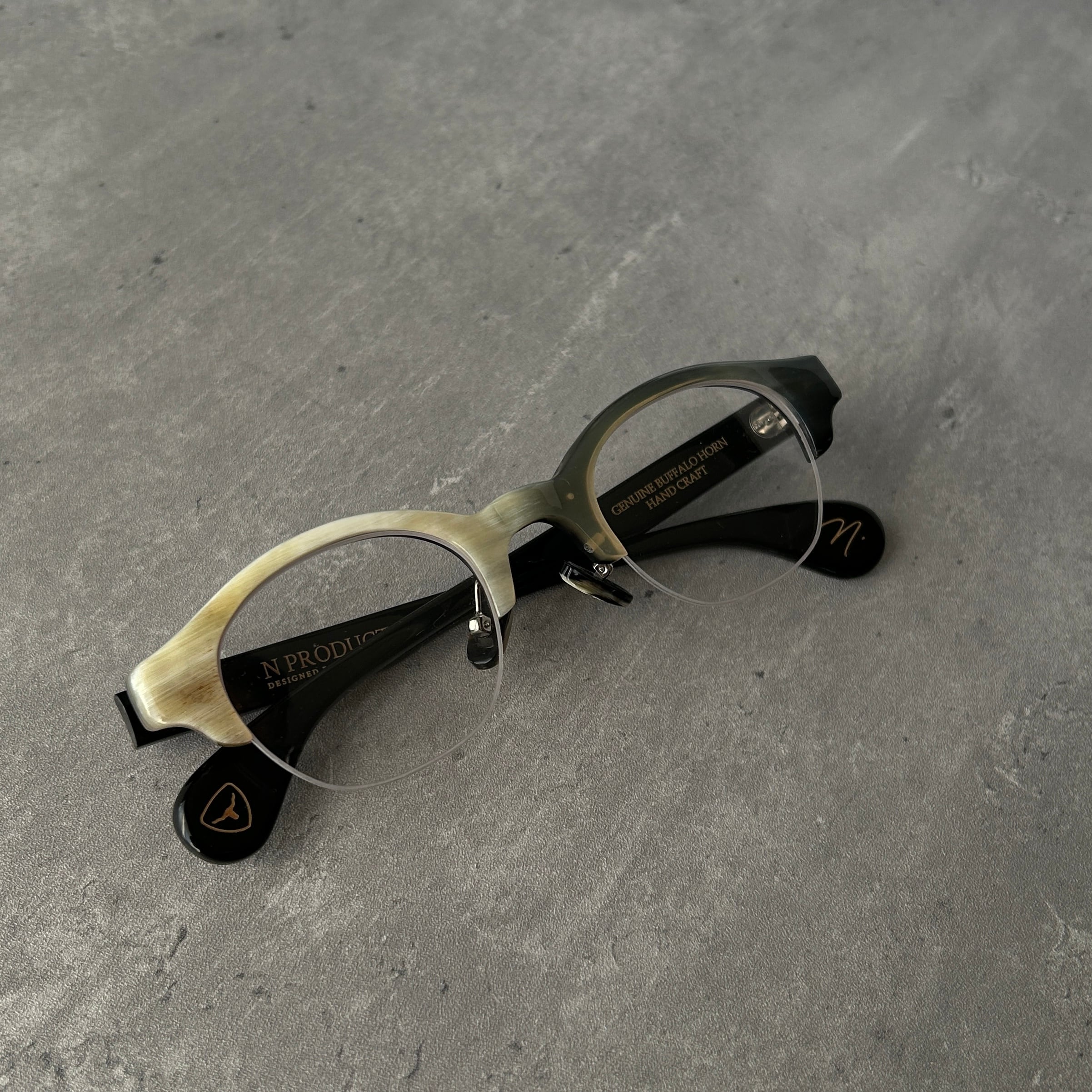 エヌプロダクトは水牛の角(バッファローホーン)製の眼鏡ブランドです。バッファローホーンは黒茶白のセピア調の色味で構成されており、それらの色が油絵のように重なり様々な表情を生み出します。バッファローホーンの先端部分はダッフルコートのボタンやピアス・アクセサリー等に加工されます。私達は眼鏡ブランドとしてのノウハウを活かし、厚みのある根元の部分を採用しアイウェアを製作しました。