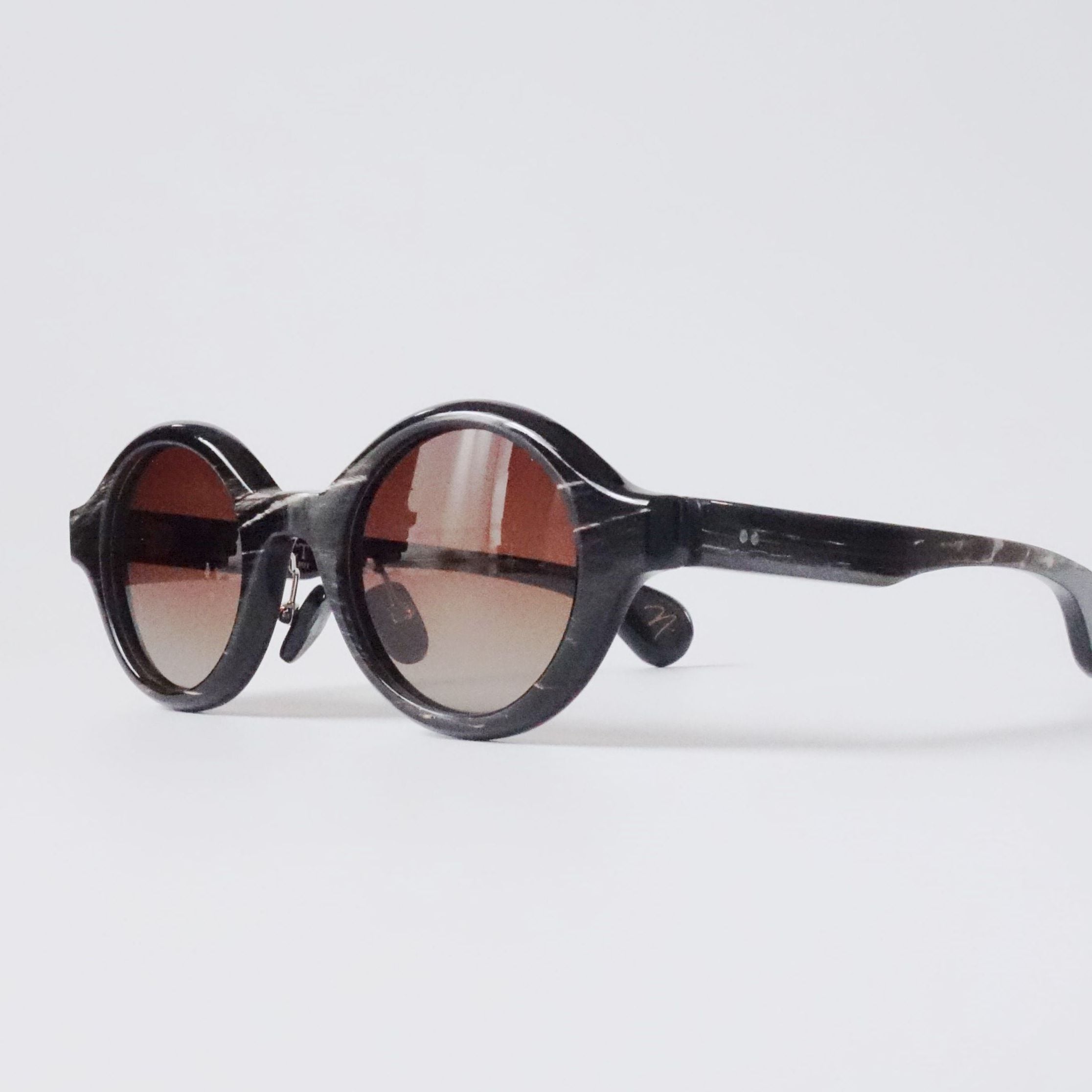 エヌプロダクトは水牛の角(バッファローホーン)製の眼鏡ブランドです。バッファローホーンは黒茶白のセピア調の色味で構成されており、それらの色が油絵のように重なり様々な表情を生み出します。バッファローホーンの先端部分はダッフルコートのボタンやピアス・アクセサリー等に加工されます。私達は眼鏡ブランドとしてのノウハウを活かし、厚みのある根元の部分を採用しアイウェアを製作しました。