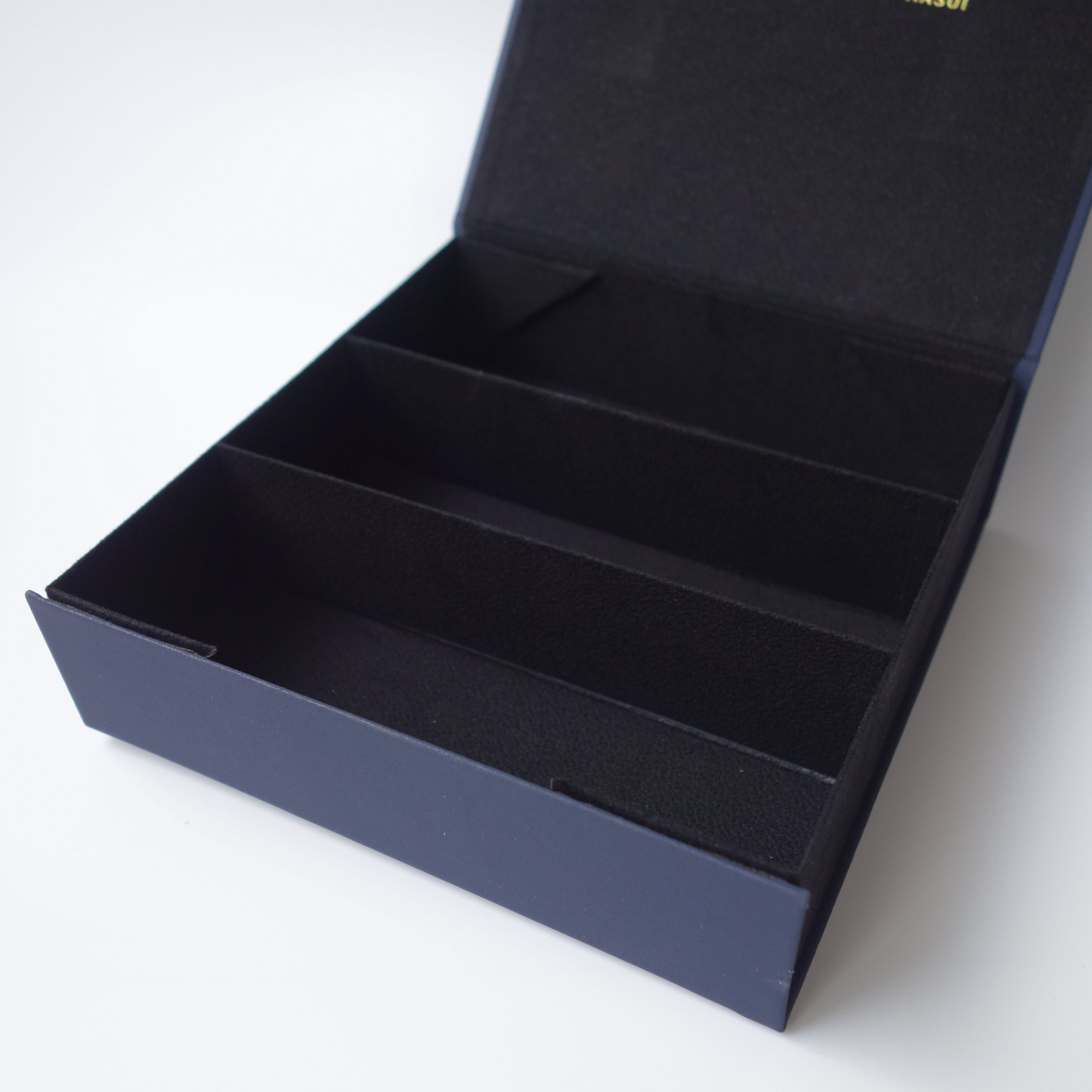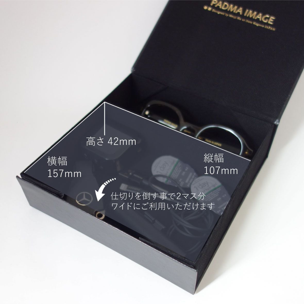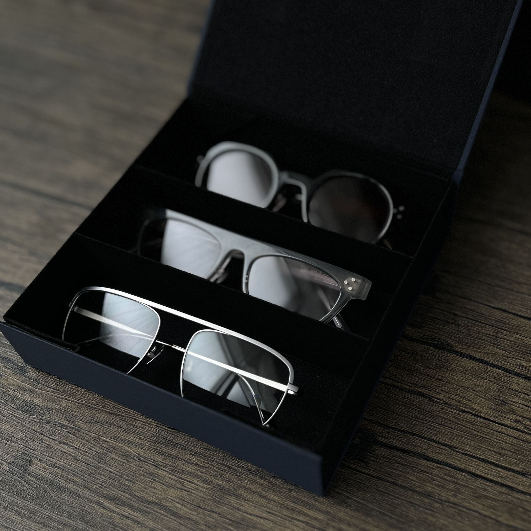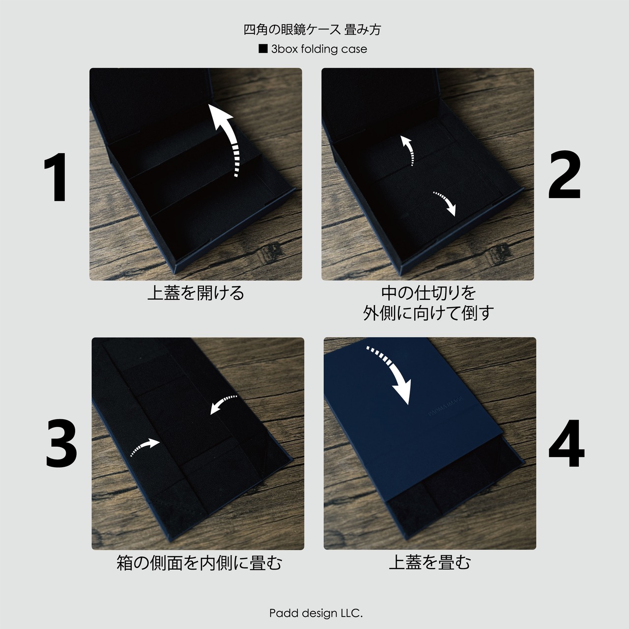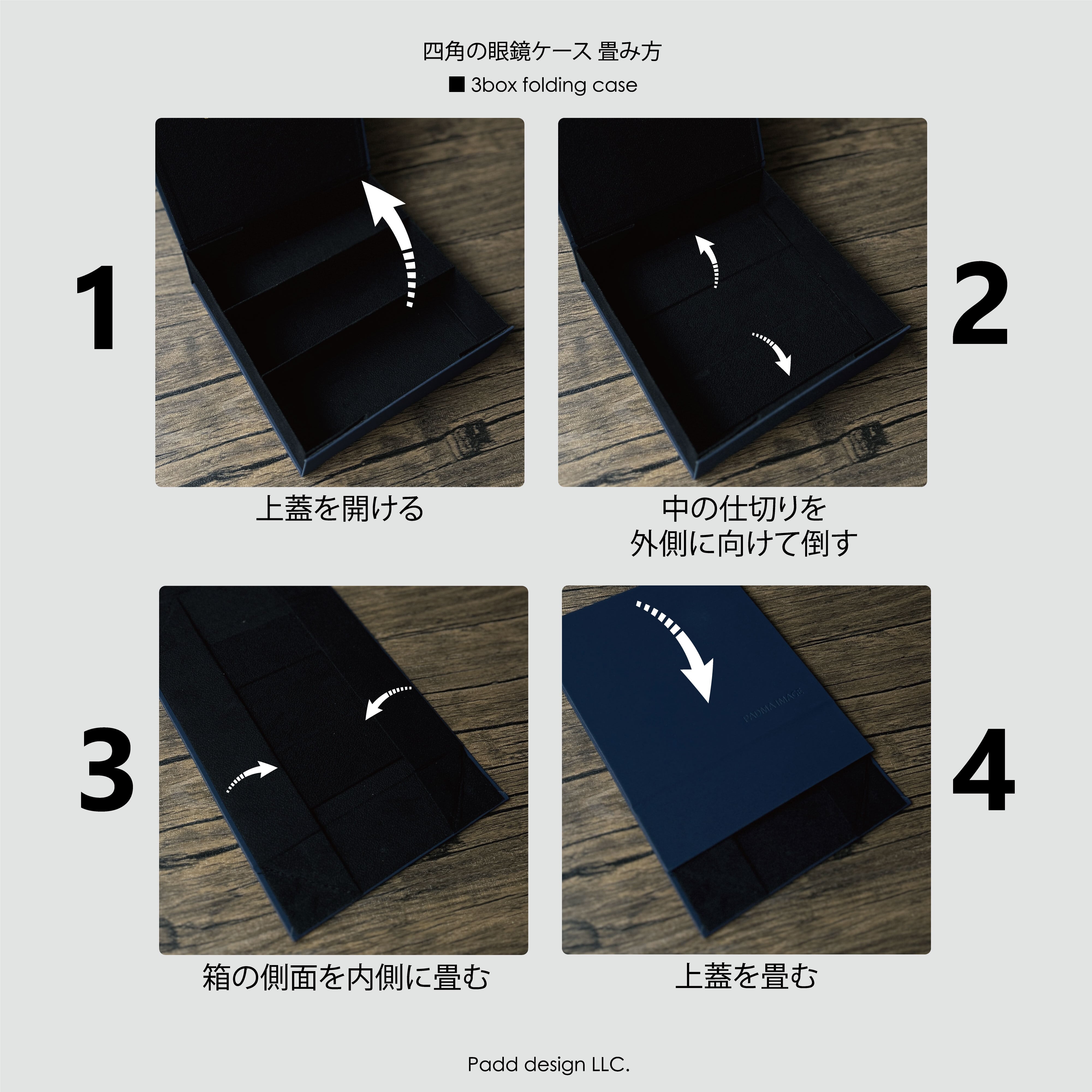 四角の眼鏡ケースは眼鏡を3本収納出来る「多目的コレクションケース」です。一人で複数のメガネをお持ちの方以外にも、家族でシェアしたり、時計やアクセサリーの収納にも便利です。さらに仕切りを倒すことが出来る為、2本分のスペースをワイドに使用する事ができます。2本分のスペースには充電ケーブルやバッテリー・化粧品やマスクなど多目的ケースとしてもご活用いただけます。使用しないときは折り畳み可能で、折り畳んだ状態の厚みは僅か1cmと薄くコンパクトになる為、本棚の隙間などにも収納でき場所を選びません。シンプルなデザインに仕上げており、材質も質感の良いPUレザーを採用しております。