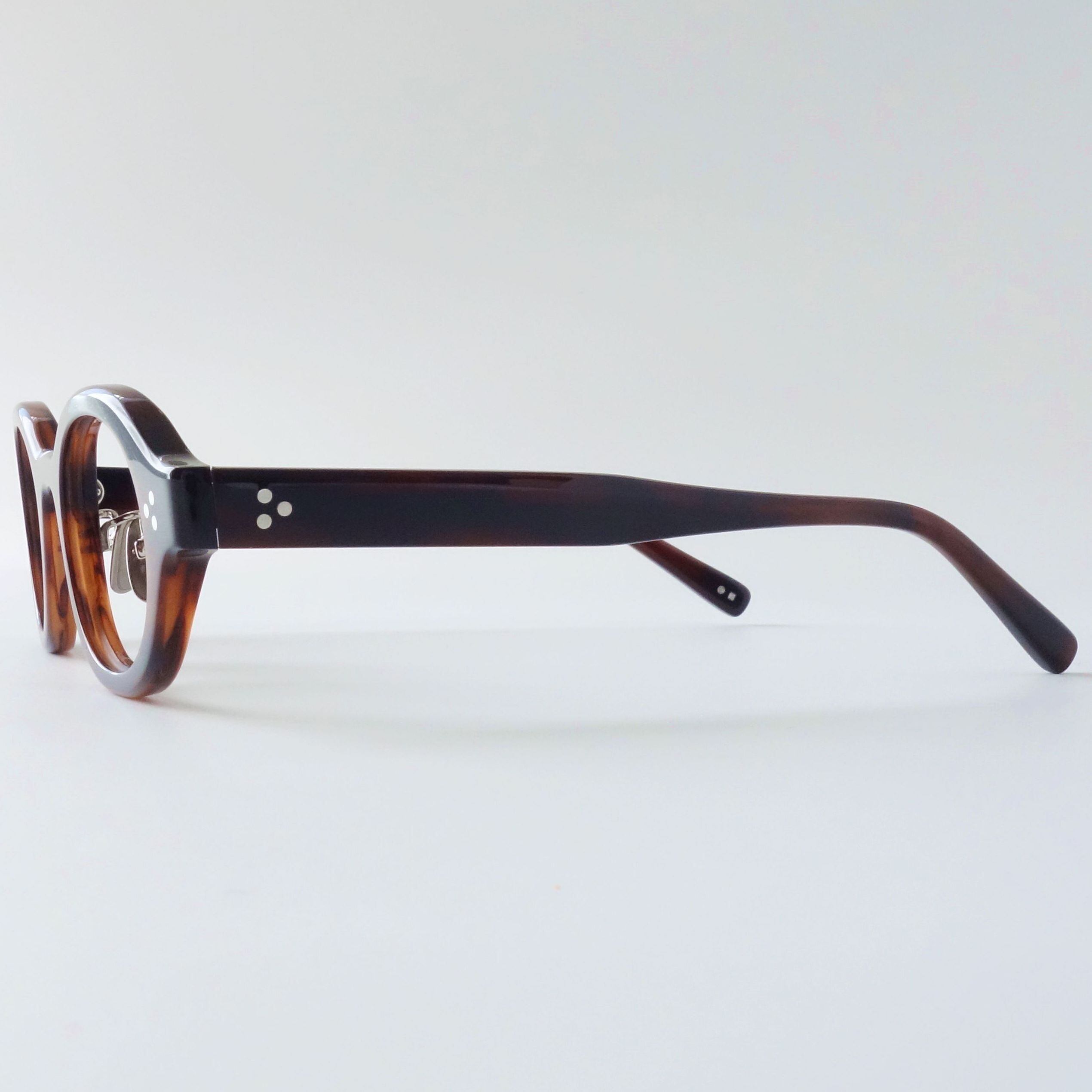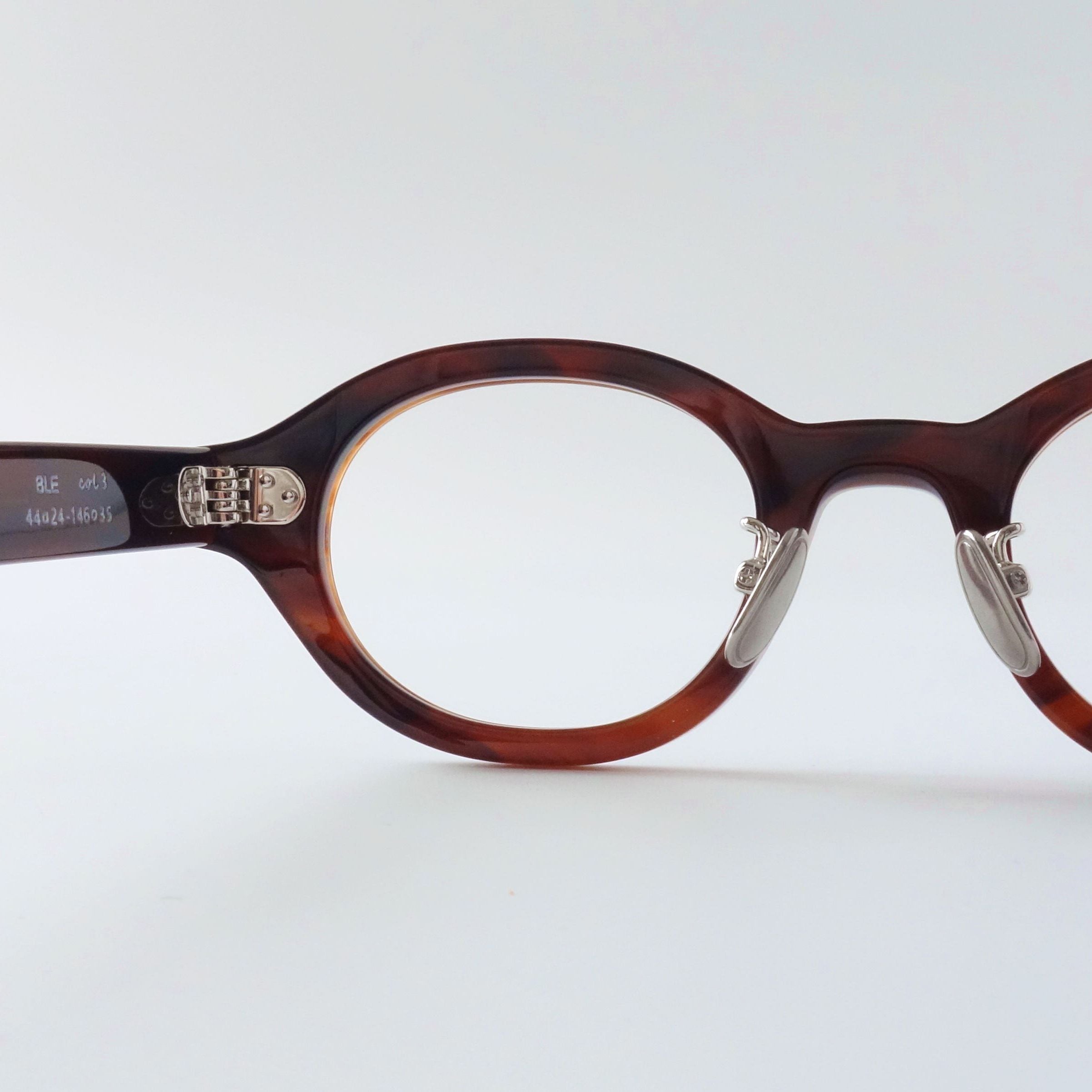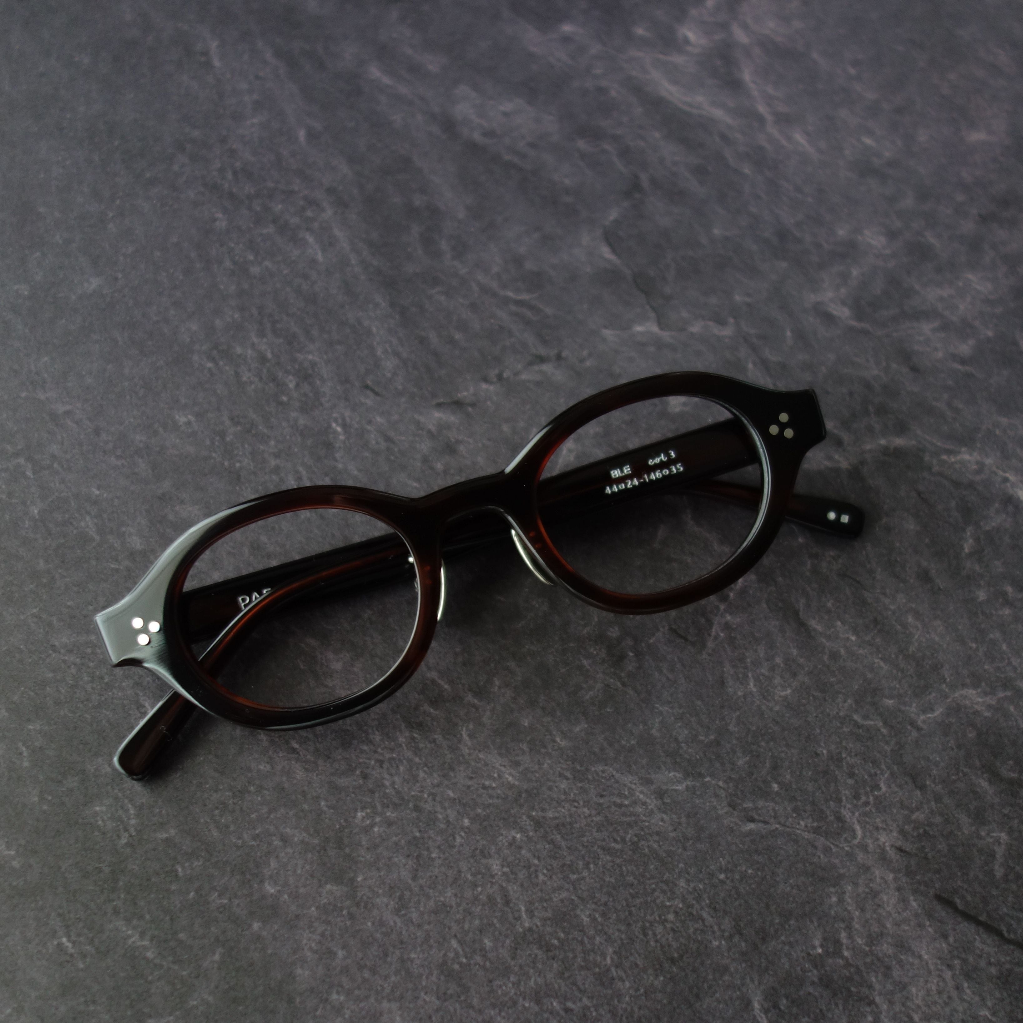 BLE(ブル)はBLEは卵の丸みをヒントにデザインしております。柔らかい曲線で構成された形状は、日本人の目元や骨格と相性が良く、やや大きめのサイズ感でボリュームを持たせることでポップな印象に仕上げました。PADMA IMAGEの初期モデルMARBLE(2014)をベースに今の時代に合わせてリデザインしております。他のジオメトリー(幾何学)コレクション同様に3ピン鋲の7枚丁番にチタンパットが程よく重厚なイメージ。テンプルエンドにはブランドのコンセプトである「幾何学と非対称」を象徴する●■が刻印されています。
