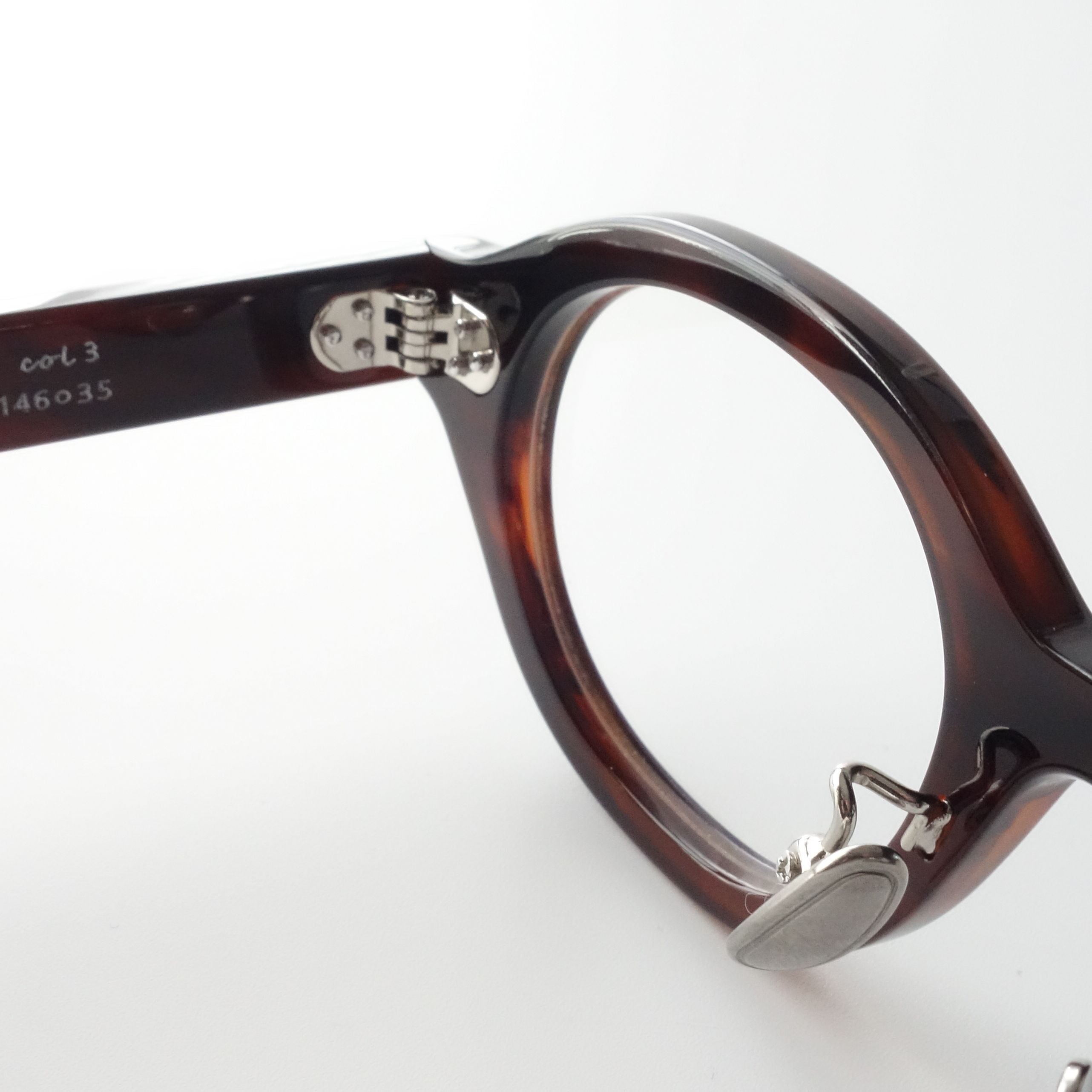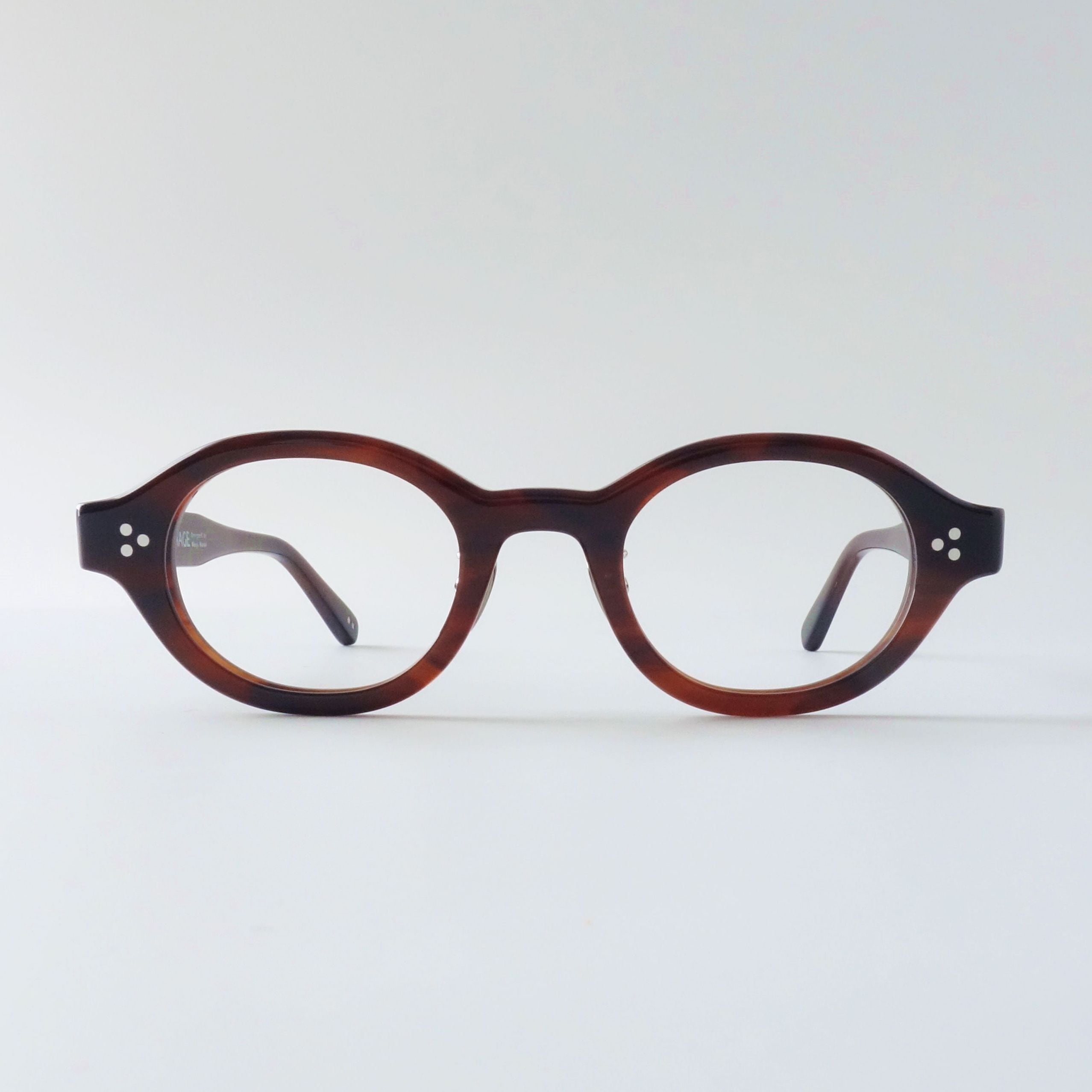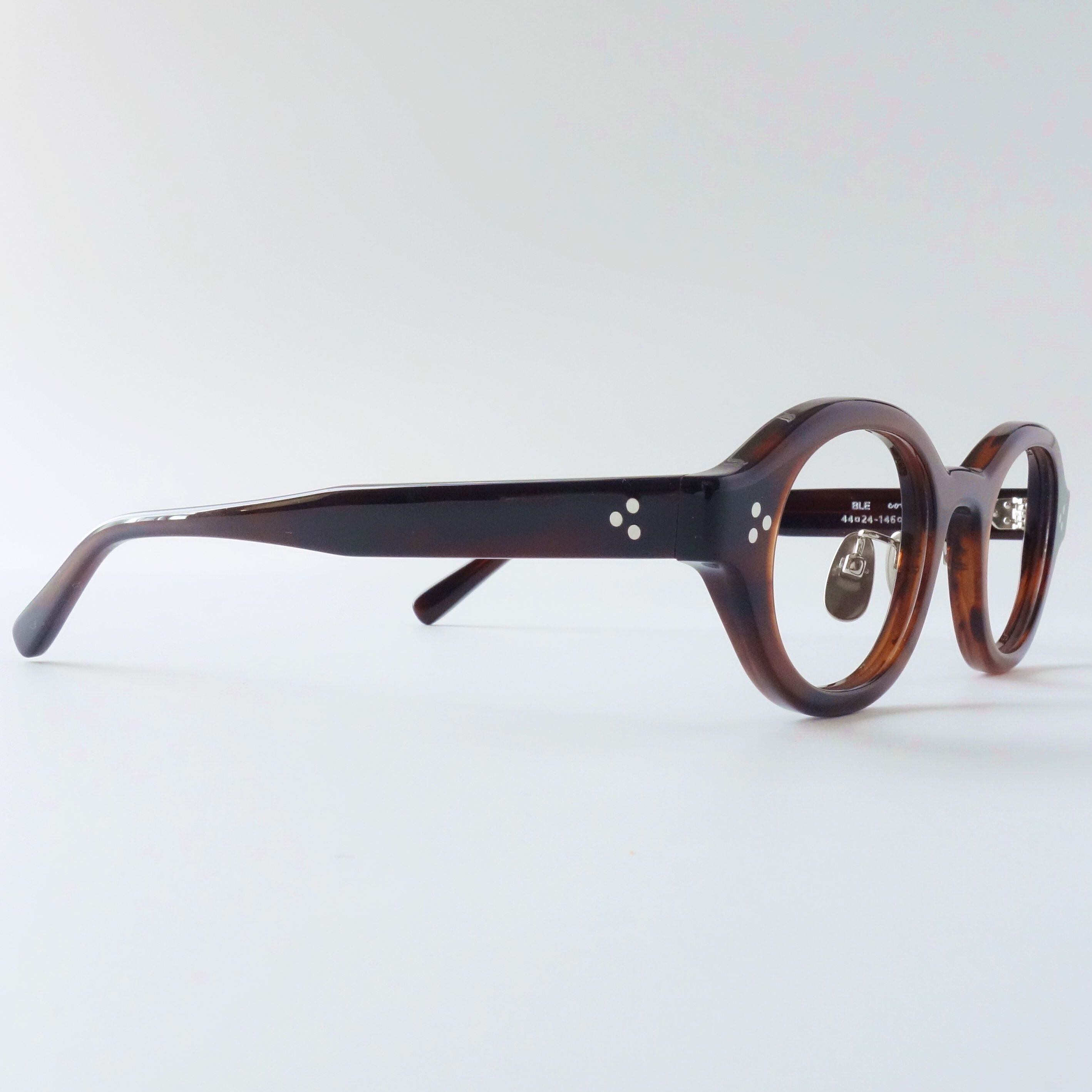 BLE(ブル)はBLEは卵の丸みをヒントにデザインしております。柔らかい曲線で構成された形状は、日本人の目元や骨格と相性が良く、やや大きめのサイズ感でボリュームを持たせることでポップな印象に仕上げました。PADMA IMAGEの初期モデルMARBLE(2014)をベースに今の時代に合わせてリデザインしております。他のジオメトリー(幾何学)コレクション同様に3ピン鋲の7枚丁番にチタンパットが程よく重厚なイメージ。テンプルエンドにはブランドのコンセプトである「幾何学と非対称」を象徴する●■が刻印されています。
