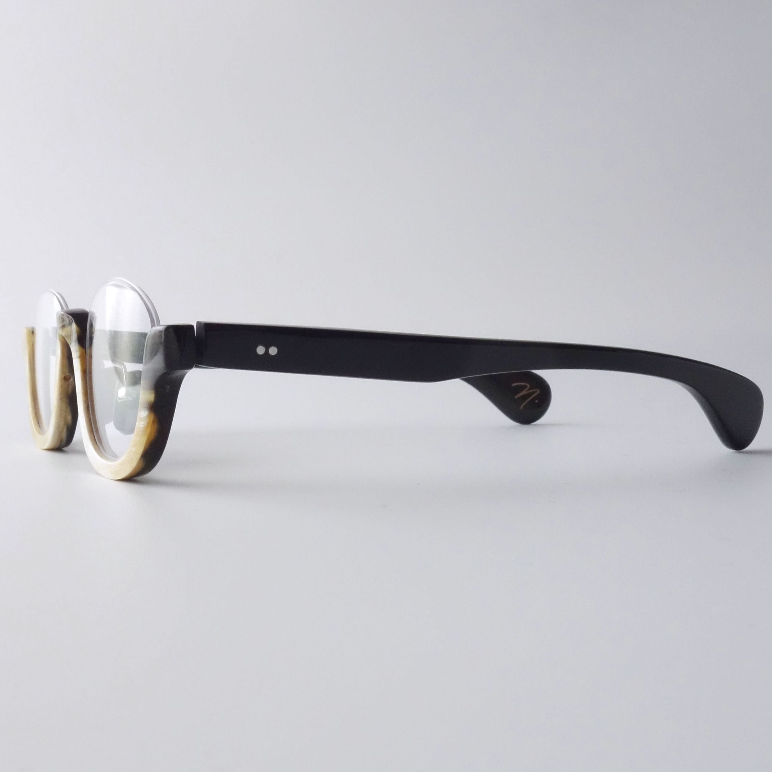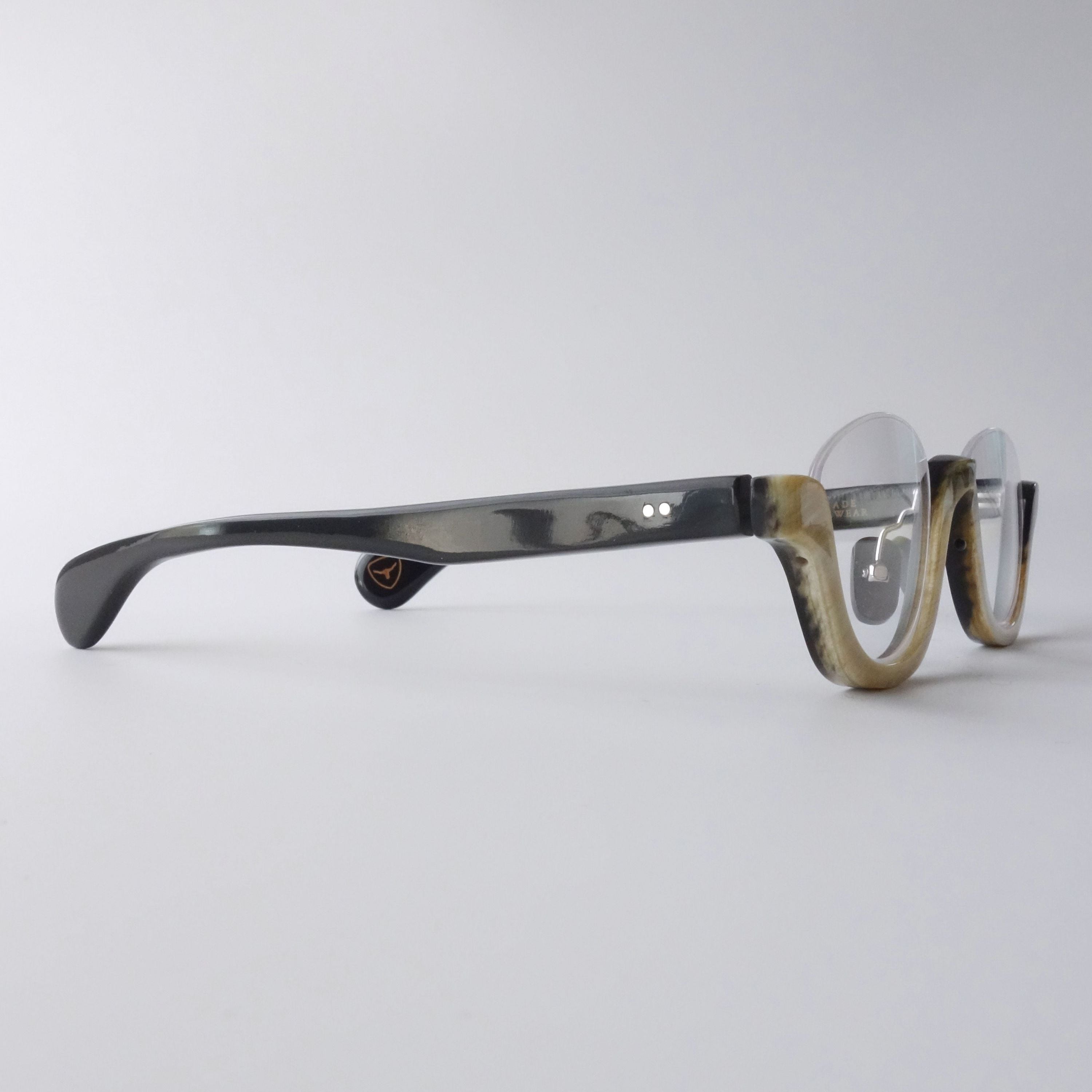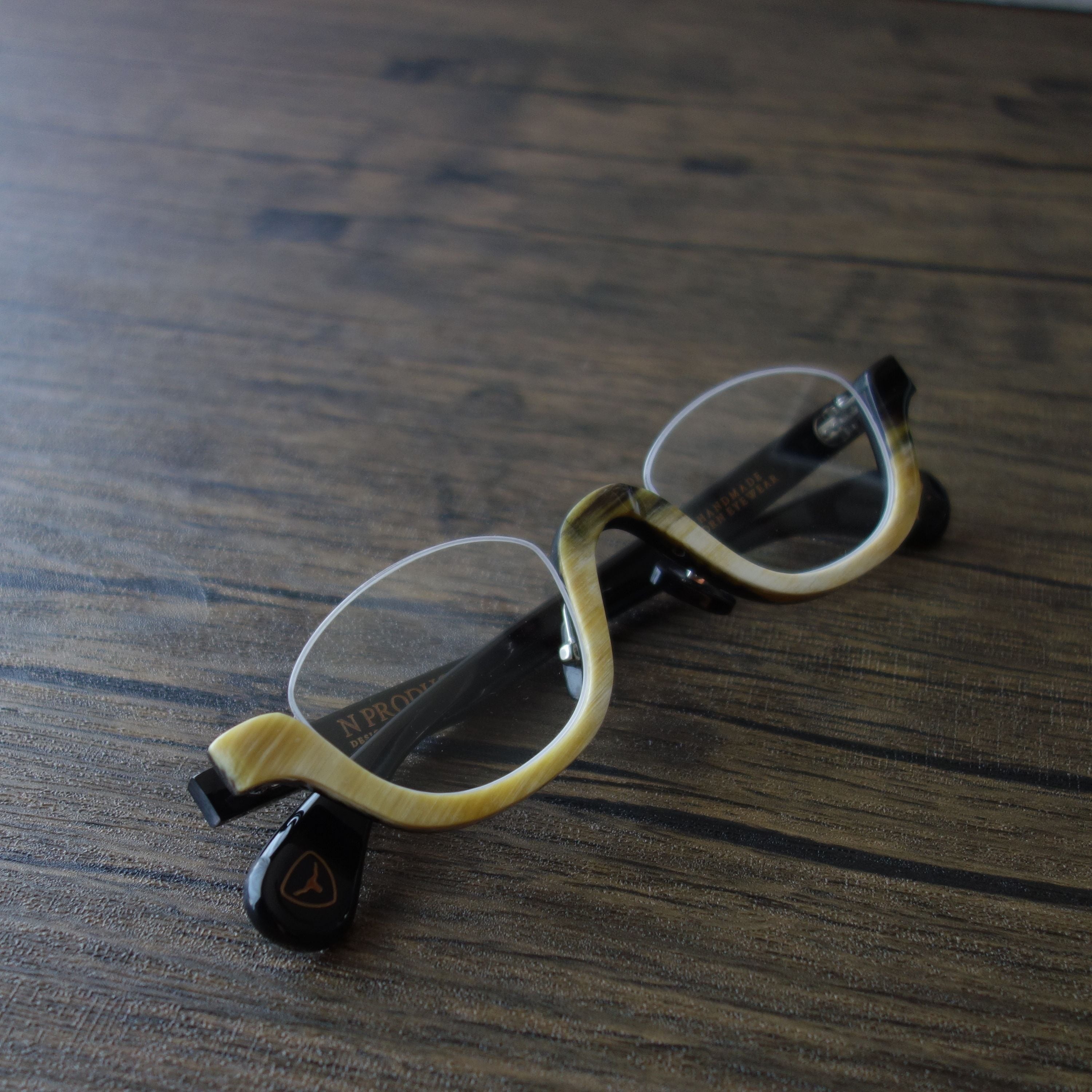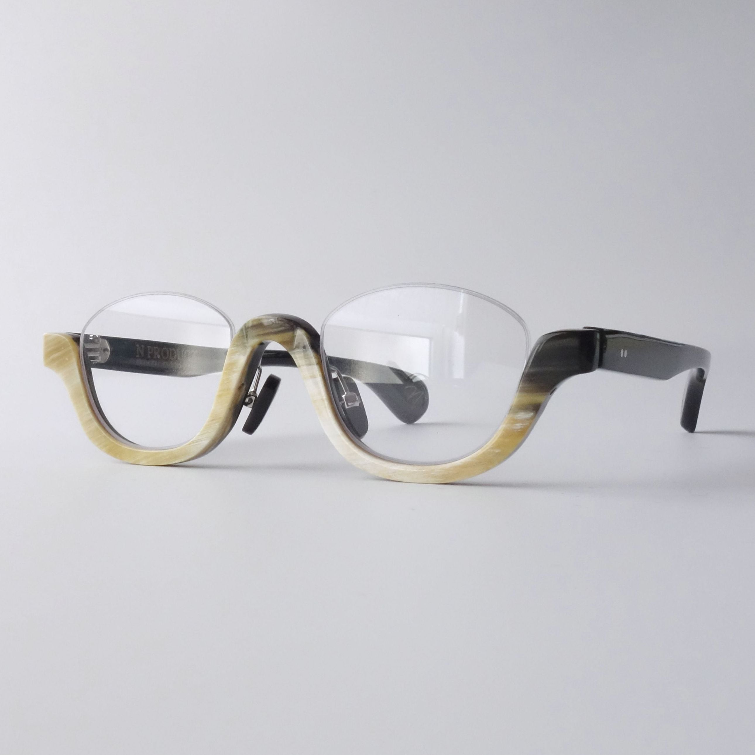 エヌプロダクトは水牛の角(バッファローホーン)製の眼鏡ブランドです。バッファローホーンは黒茶白のセピア調の色味で構成されており、それらの色が油絵のように重なり様々な表情を生み出します。バッファローホーンの先端部分はダッフルコートのボタンやピアス・アクセサリー等に加工されます。私達は眼鏡ブランドとしてのノウハウを活かし、厚みのある根元の部分を採用しアイウェアを製作しました。