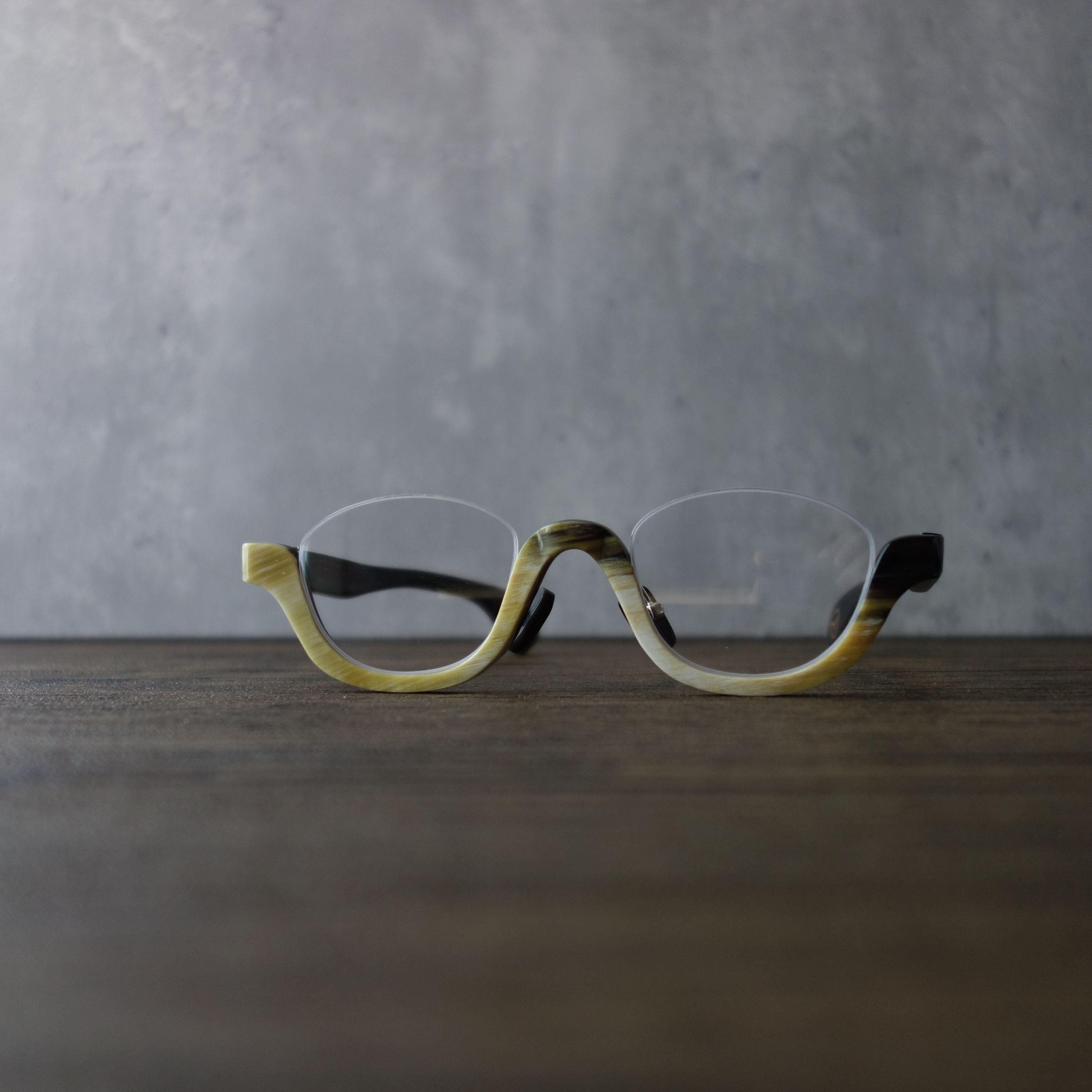 現在流通しているプラスチック製の眼鏡が出来る前の時代では、べっ甲や角などの天然素材を使った眼鏡が主流でした。眼鏡に限らずプラスチック製品の流通に伴い、天然素材は希少品という立ち位置になりました。私たちは一点一点色柄が異なるバッファローホーンの美しさに惚れ込み、バッファローホーンの魅力を最大限に活かしたアイウェアを後世に残したいと思っております。