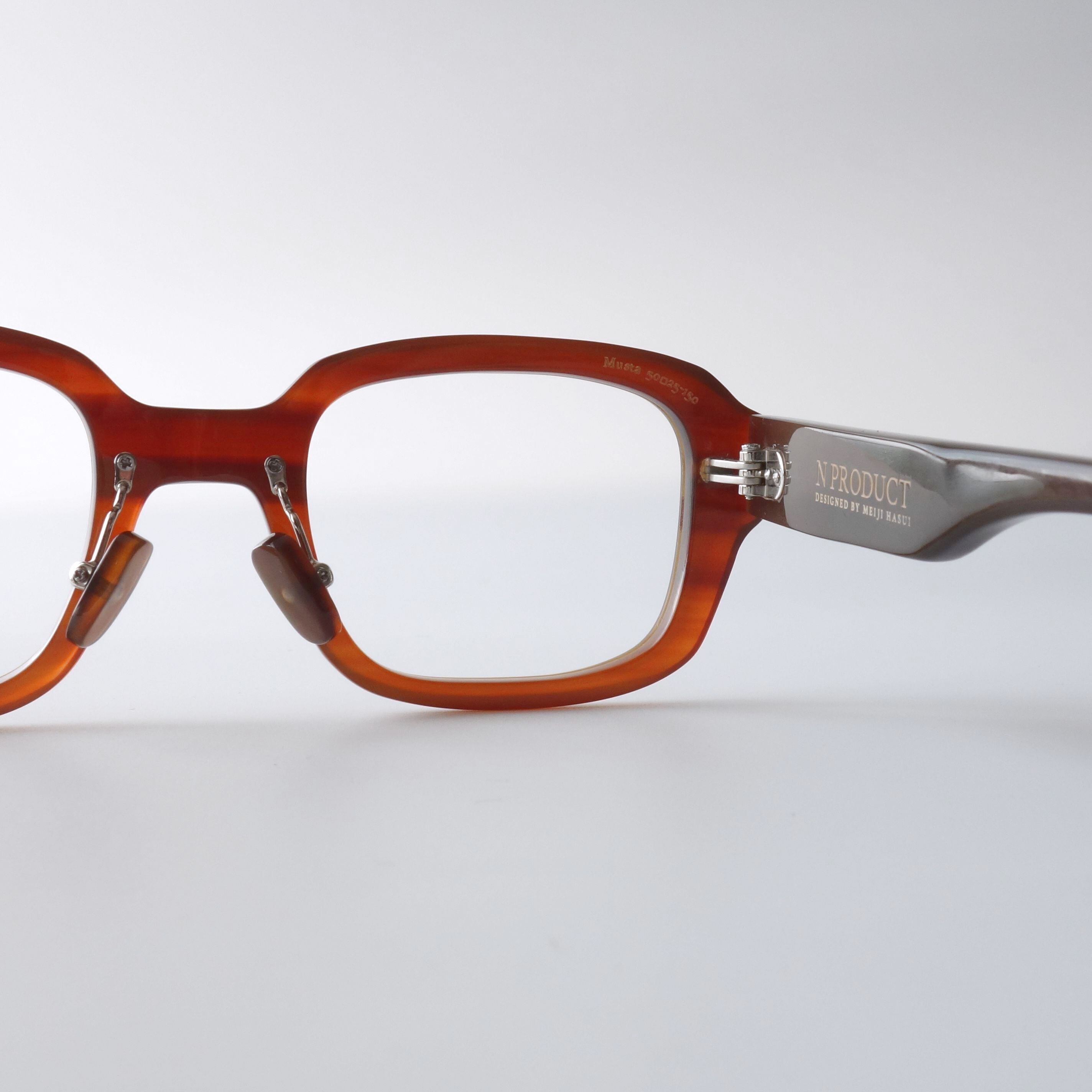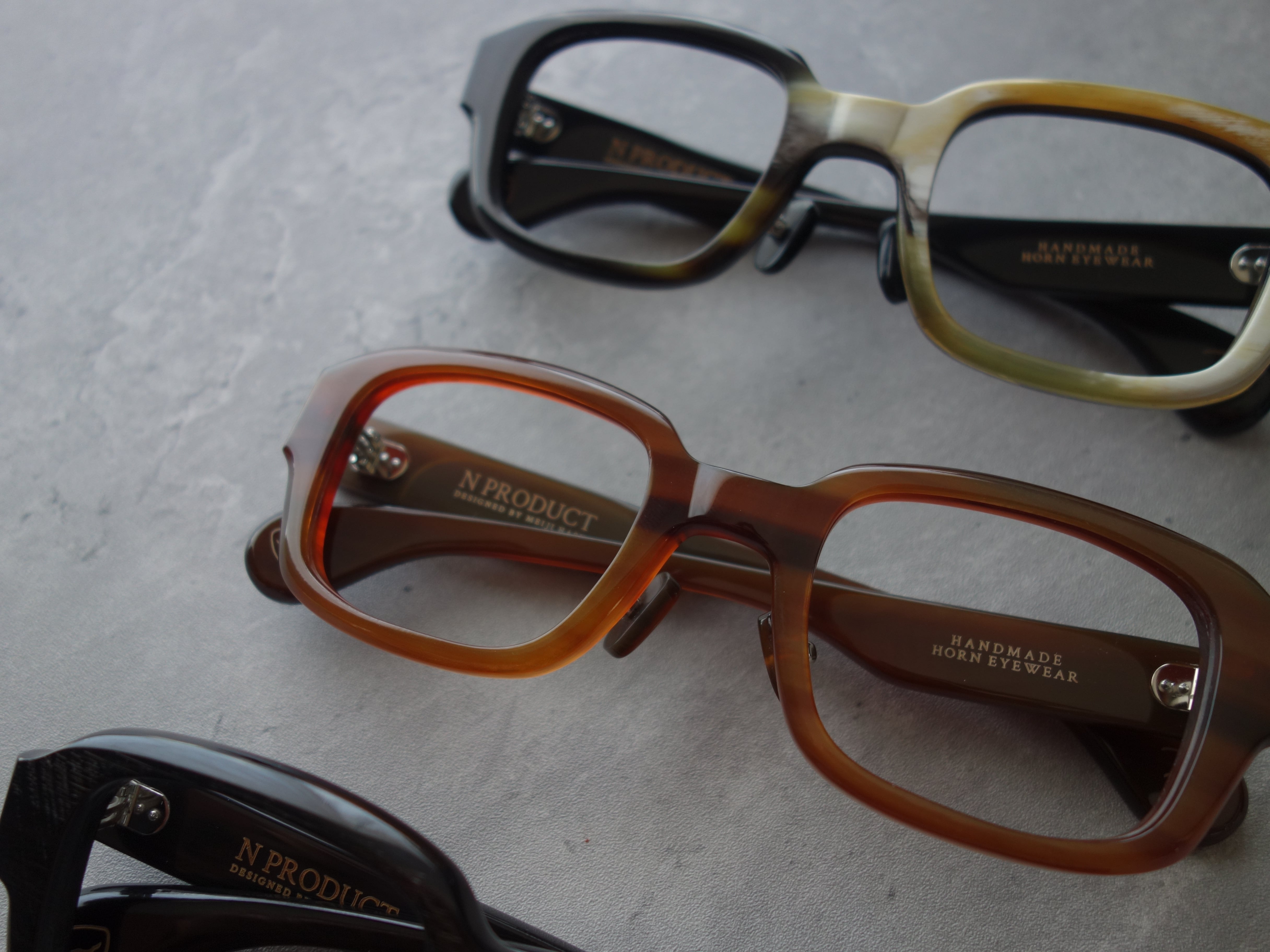 エヌプロダクトは水牛の角(バッファローホーン)製の眼鏡ブランドです。バッファローホーンは黒茶白のセピア調の色味で構成されており、それらの色が油絵のように重なり様々な表情を生み出します。バッファローホーンの先端部分はダッフルコートのボタンやピアス・アクセサリー等に加工されます。私達は眼鏡ブランドとしてのノウハウを活かし、厚みのある根元の部分を採用しアイウェアを製作しました。