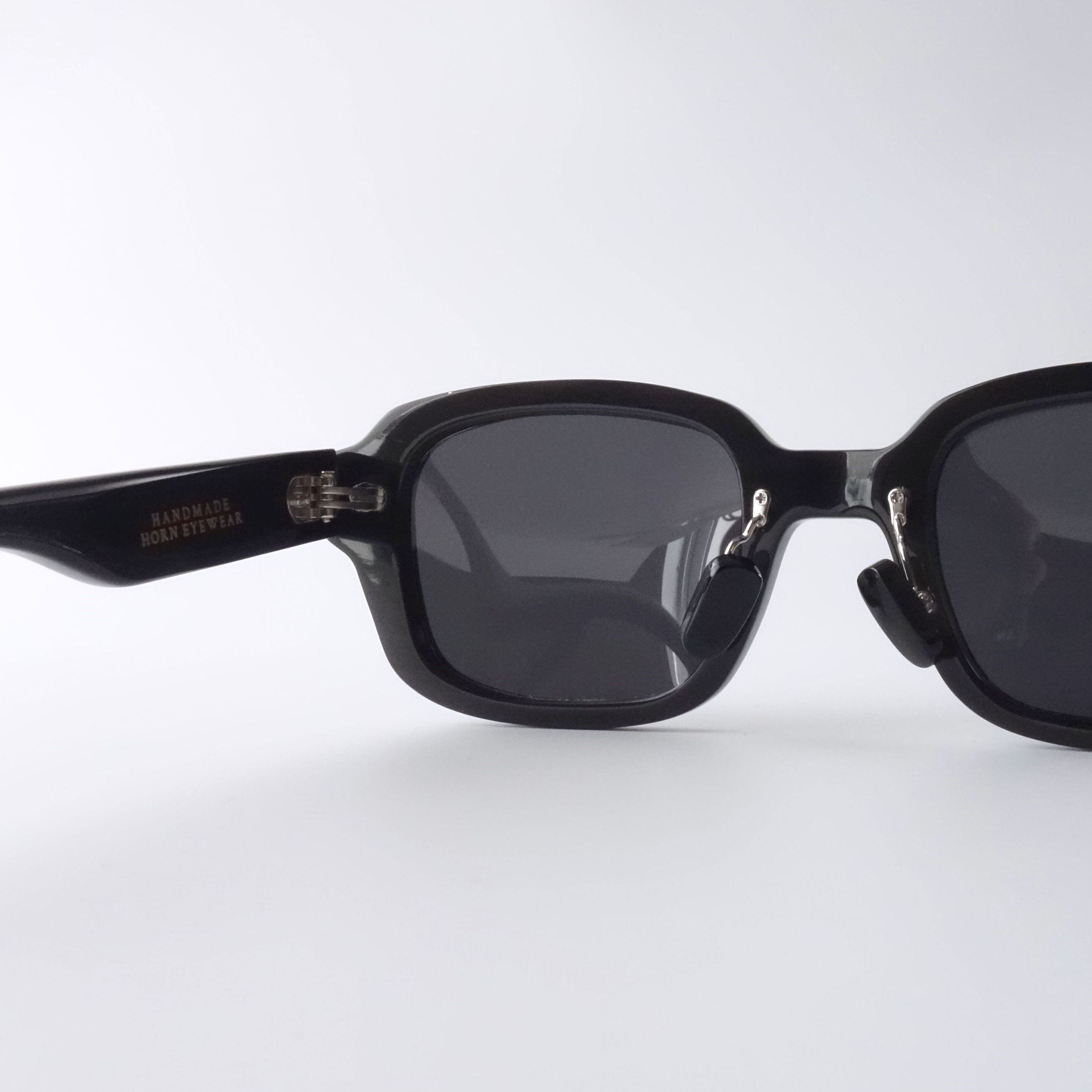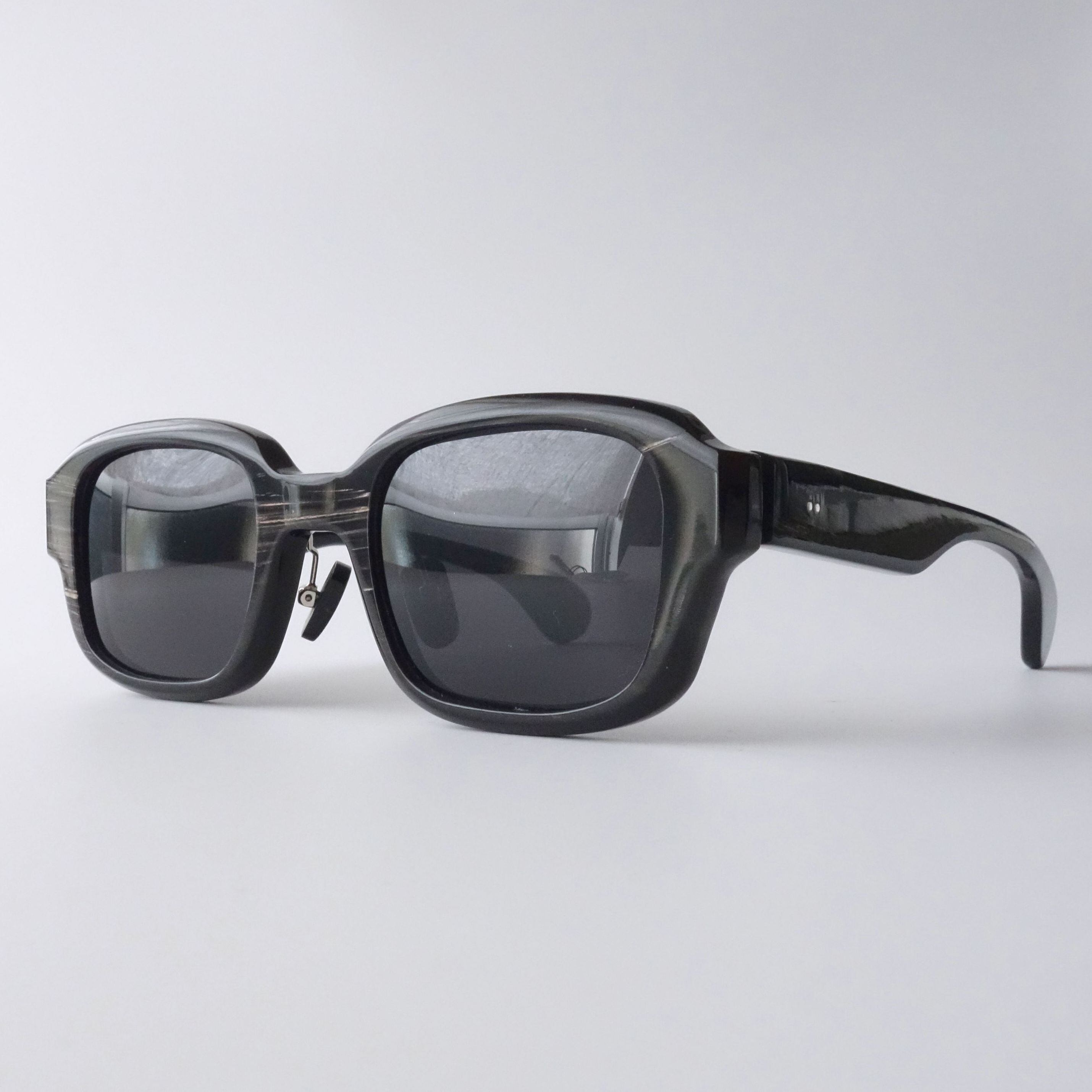 エヌプロダクトは水牛の角(バッファローホーン)製の眼鏡ブランドです。バッファローホーンは黒茶白のセピア調の色味で構成されており、それらの色が油絵のように重なり様々な表情を生み出します。バッファローホーンの先端部分はダッフルコートのボタンやピアス・アクセサリー等に加工されます。私達は眼鏡ブランドとしてのノウハウを活かし、厚みのある根元の部分を採用しアイウェアを製作しました。