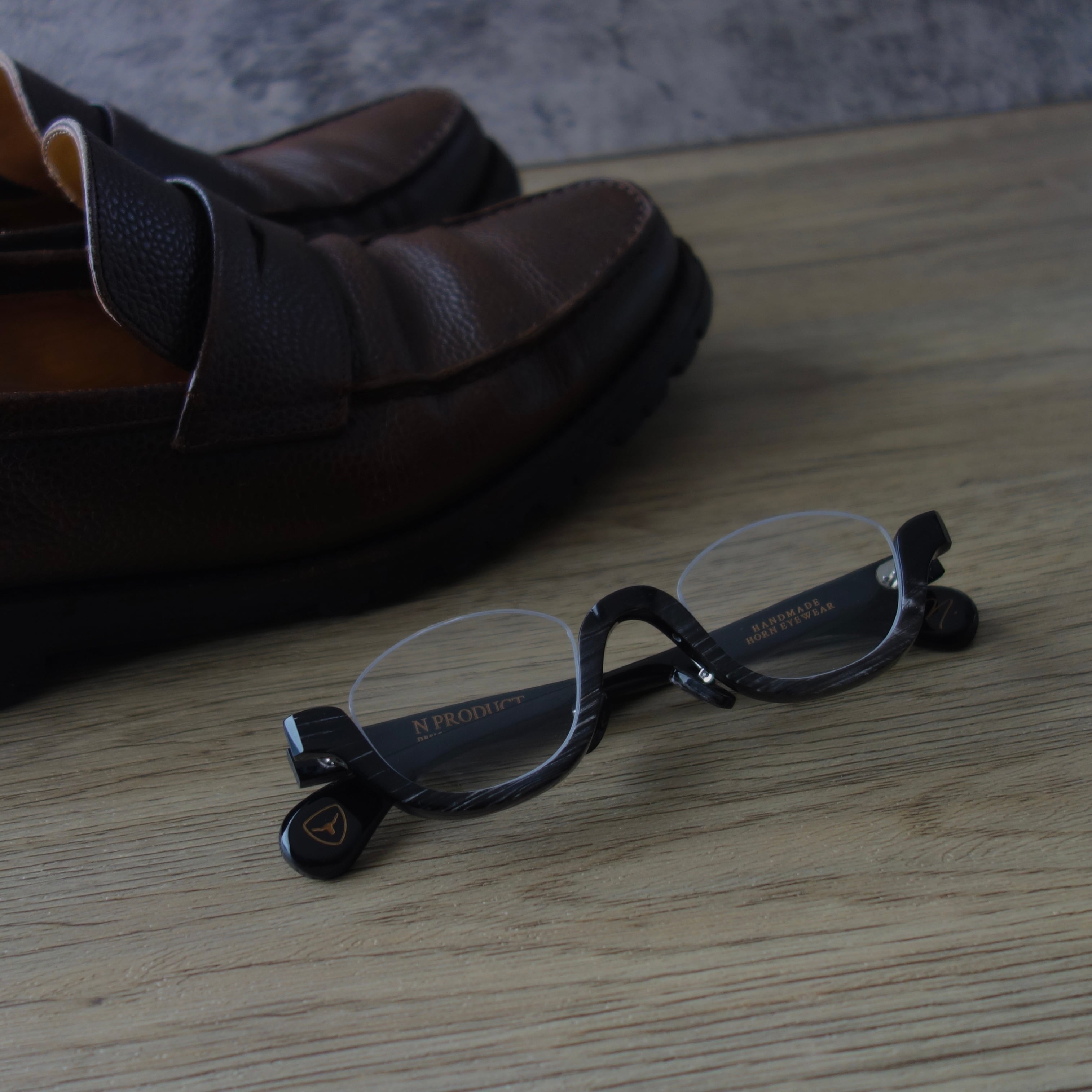 エヌプロダクトは水牛の角(バッファローホーン)製の眼鏡ブランドです。バッファローホーンは黒茶白のセピア調の色味で構成されており、それらの色が油絵のように重なり様々な表情を生み出します。バッファローホーンの先端部分はダッフルコートのボタンやピアス・アクセサリー等に加工されます。私達は眼鏡ブランドとしてのノウハウを活かし、厚みのある根元の部分を採用しアイウェアを製作しました。