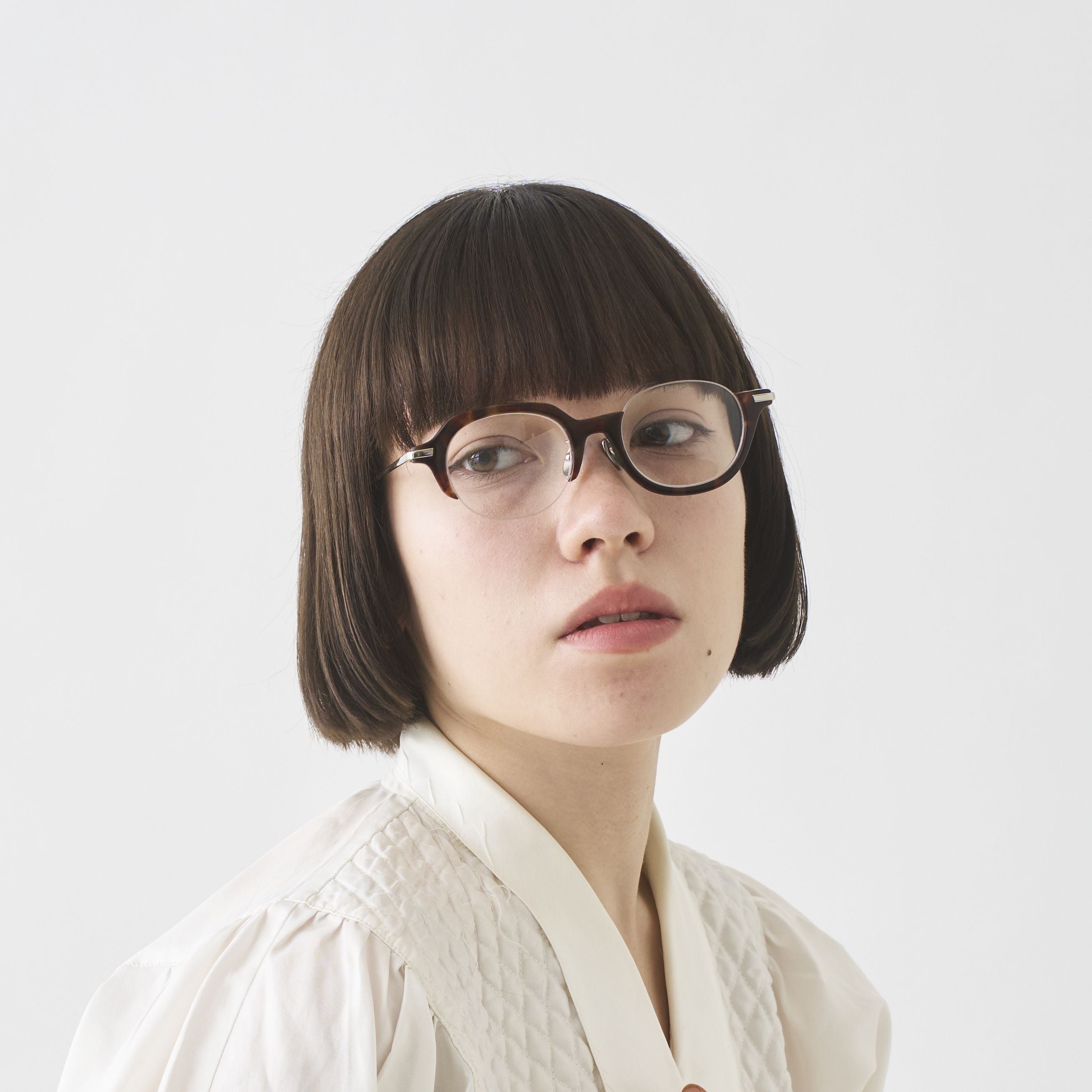 パドマイメージが5周年の時に生産したコンセプトモデルの復刻です。これまで生産してきたウエシタに比べ、ややコンパクトなサイズ感に仕上げております。名前の通り、上と下に分かれたリムのデザインが特徴的です。一見アンバランスに見えますが、枠のボリュームを左右で整えることで、着用時の違和感を抑えております。