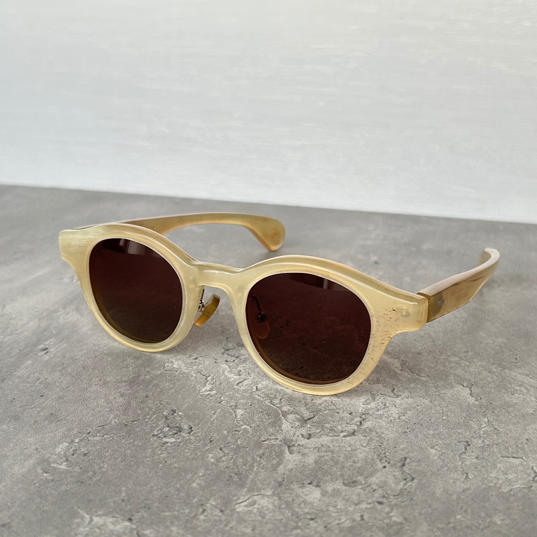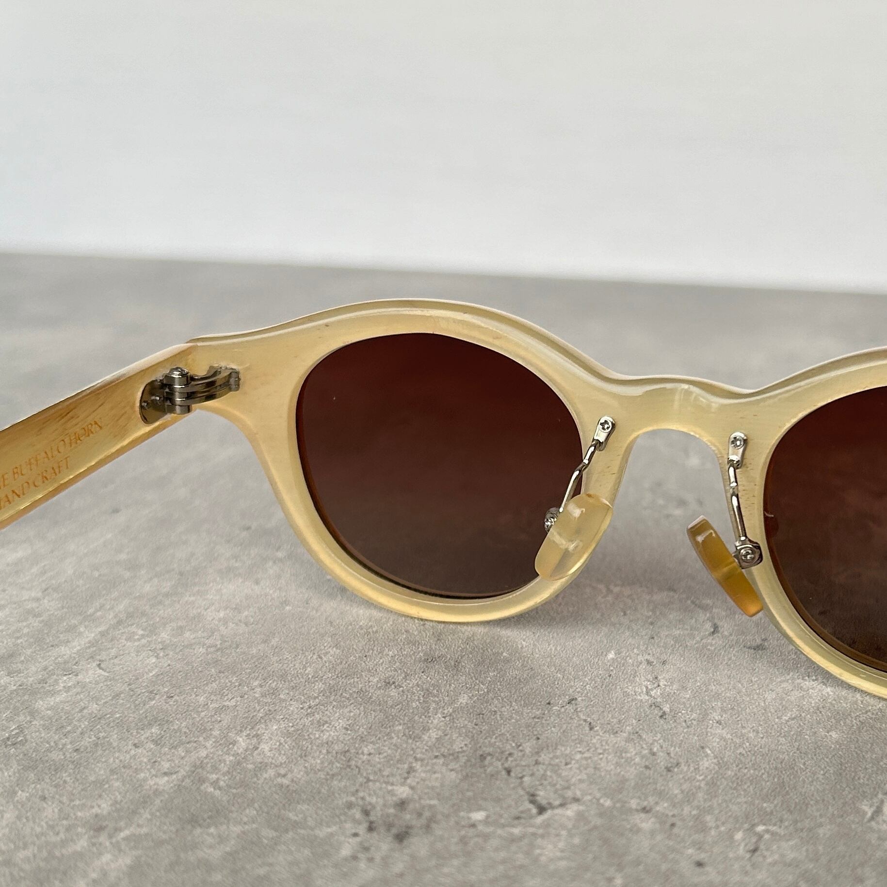エヌプロダクトは水牛の角(バッファローホーン)製の眼鏡ブランドです。バッファローホーンは黒茶白のセピア調の色味で構成されており、それらの色が油絵のように重なり様々な表情を生み出します。バッファローホーンの先端部分はダッフルコートのボタンやピアス・アクセサリー等に加工されます。私達は眼鏡ブランドとしてのノウハウを活かし、厚みのある根元の部分を採用しアイウェアを製作しました。
