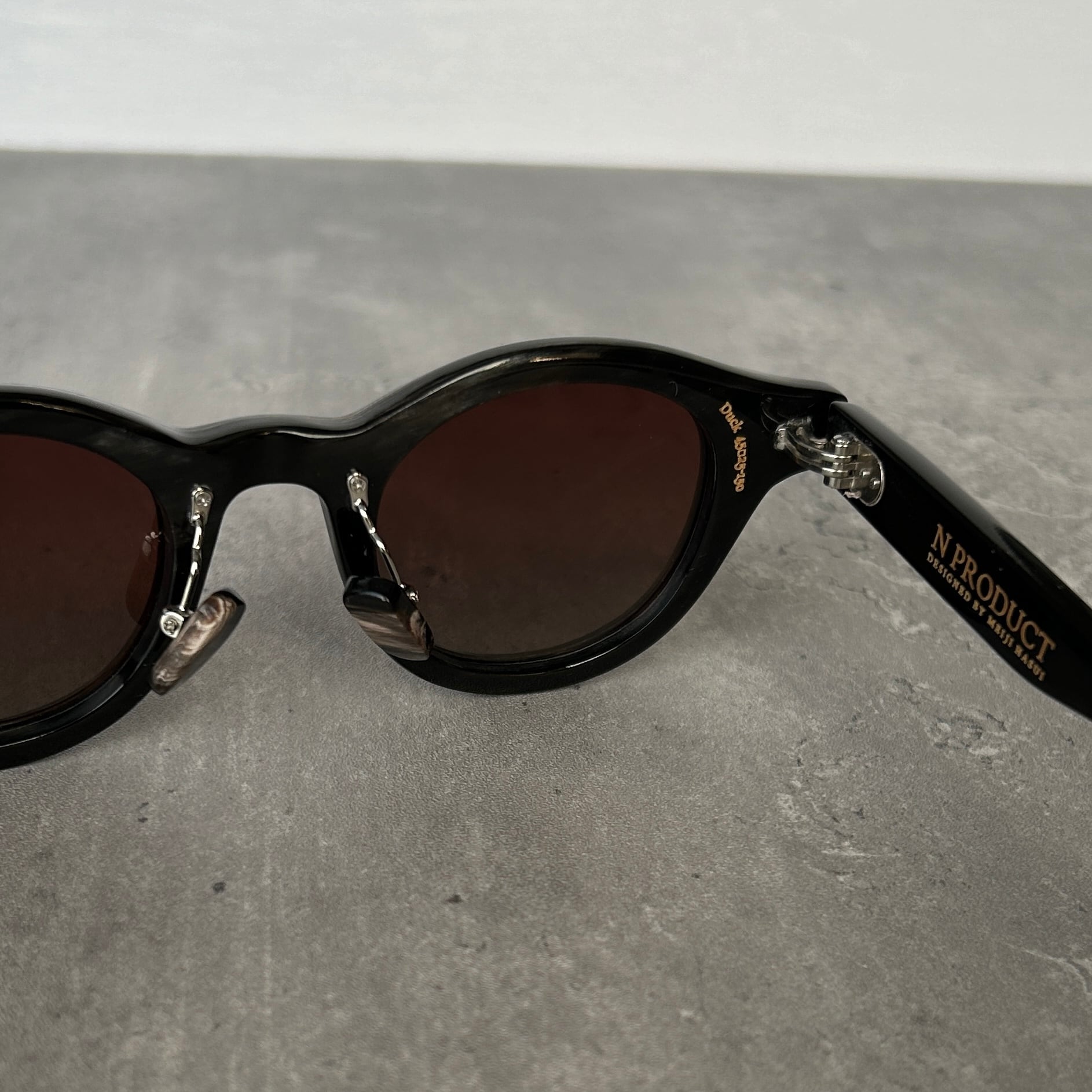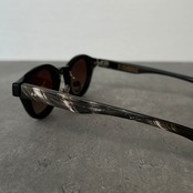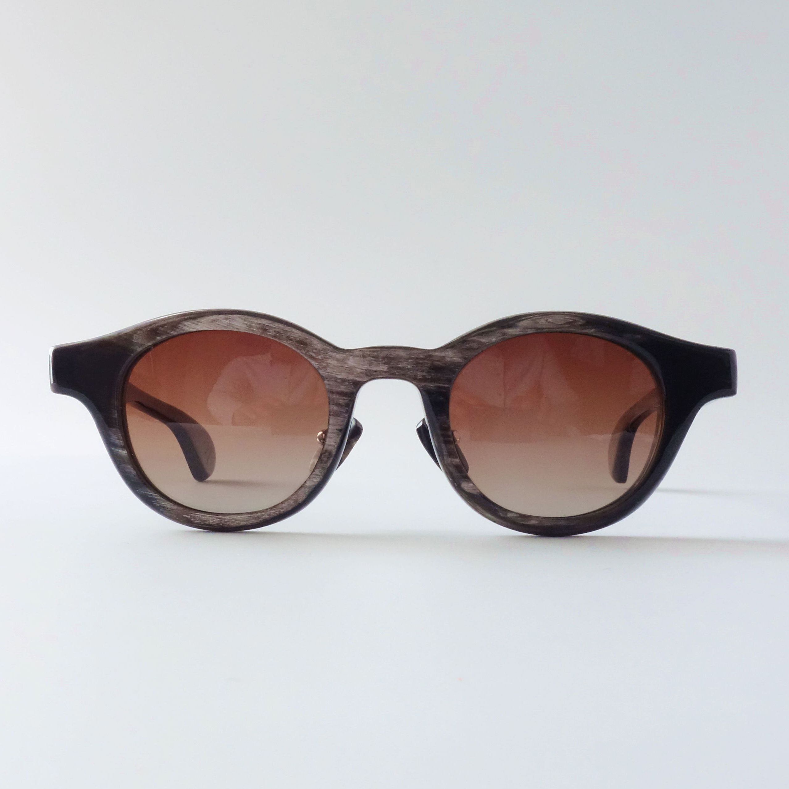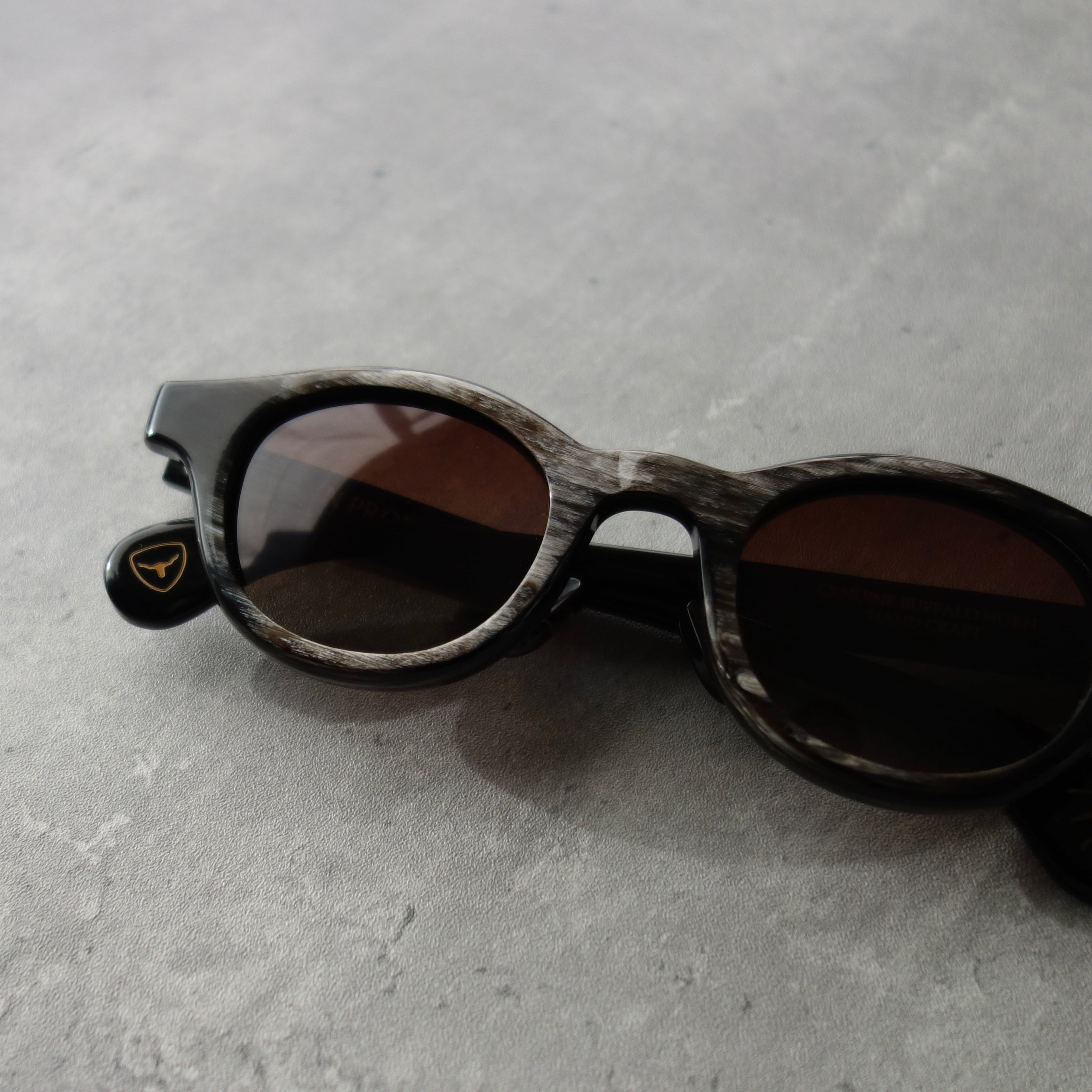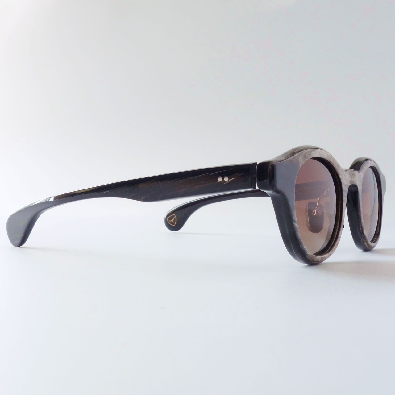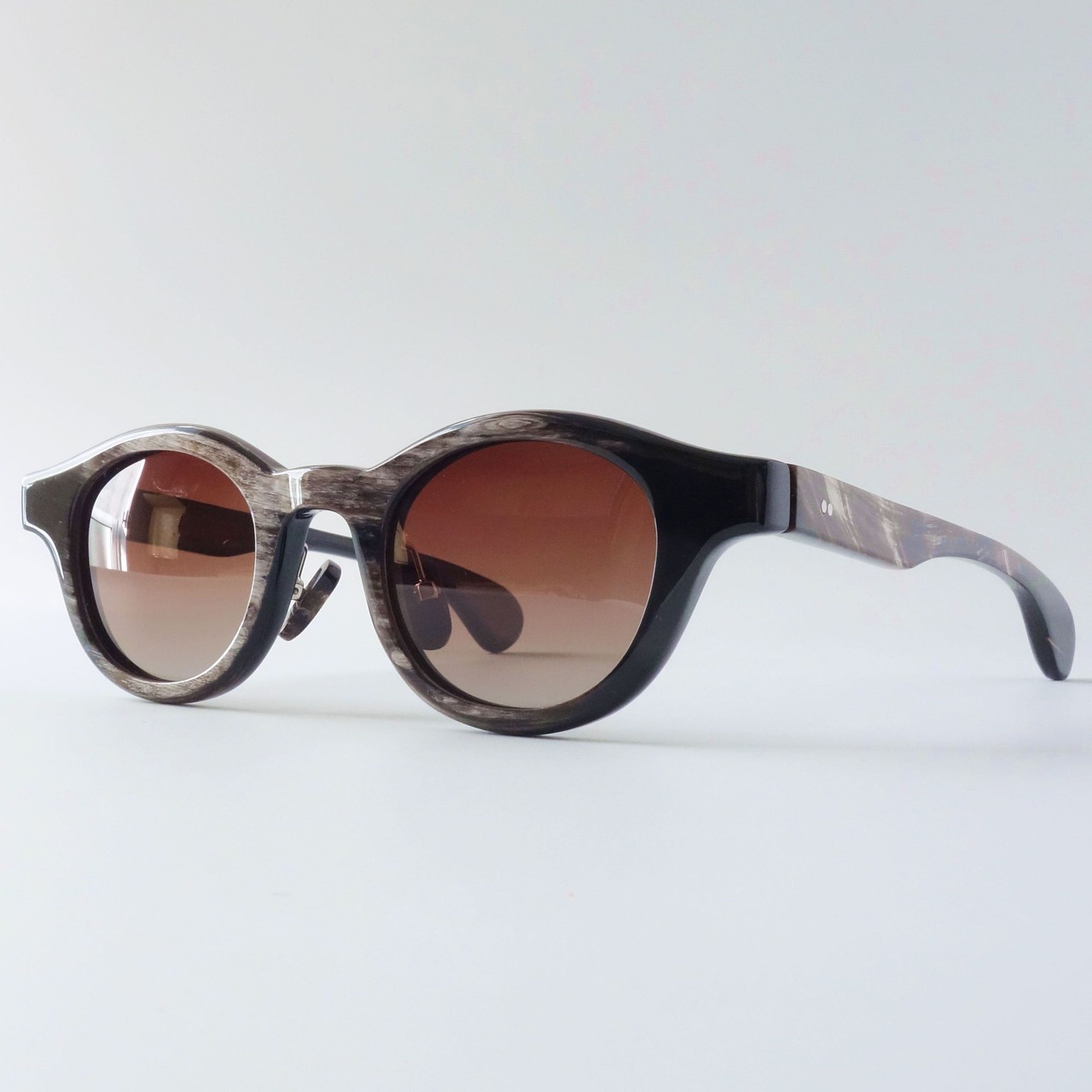 エヌプロダクトは水牛の角(バッファローホーン)製の眼鏡ブランドです。バッファローホーンは黒茶白のセピア調の色味で構成されており、それらの色が油絵のように重なり様々な表情を生み出します。バッファローホーンの先端部分はダッフルコートのボタンやピアス・アクセサリー等に加工されます。私達は眼鏡ブランドとしてのノウハウを活かし、厚みのある根元の部分を採用しアイウェアを製作しました。