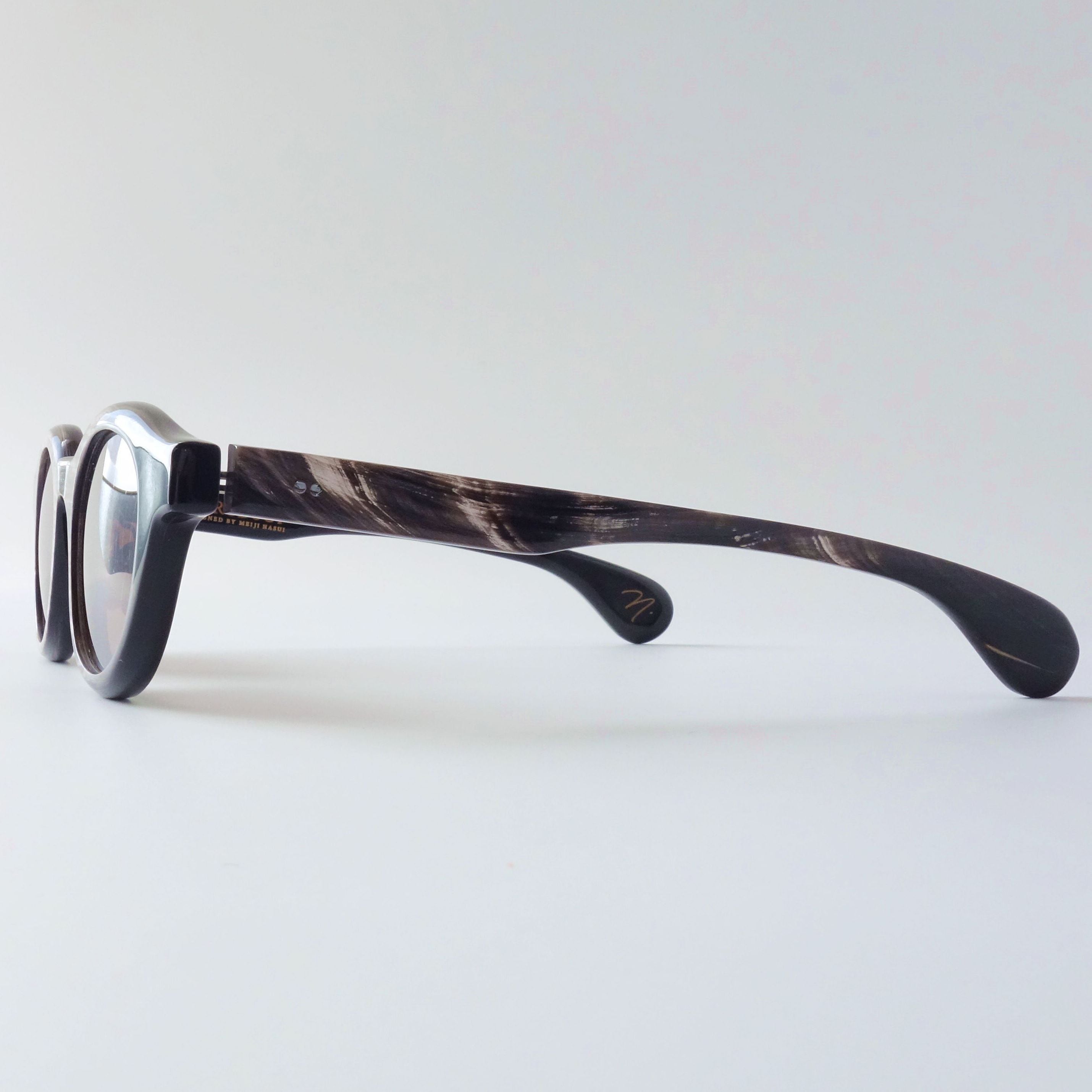 現在流通しているプラスチック製の眼鏡が出来る前の時代では、べっ甲や角などの天然素材を使った眼鏡が主流でした。眼鏡に限らずプラスチック製品の流通に伴い、天然素材は希少品という立ち位置になりました。私たちは一点一点色柄が異なるバッファローホーンの美しさに惚れ込み、バッファローホーンの魅力を最大限に活かしたアイウェアを後世に残したいと思っております。