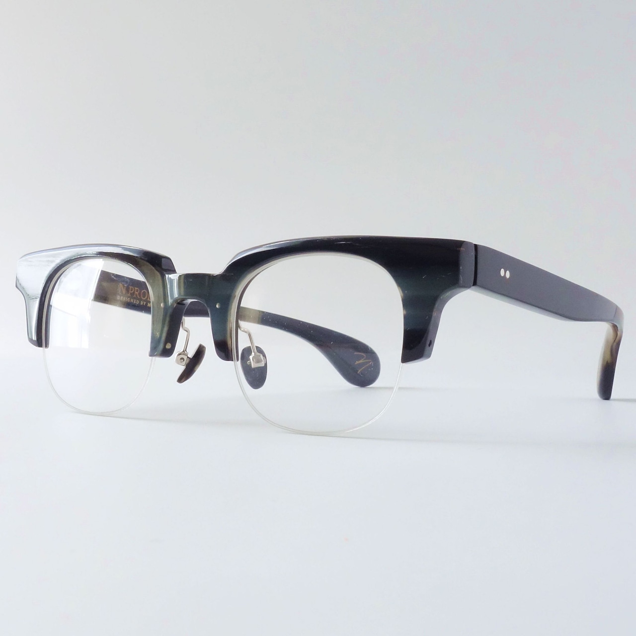 エヌプロダクトは水牛の角(バッファローホーン)製の眼鏡ブランドです。バッファローホーンは黒茶白のセピア調の色味で構成されており、それらの色が油絵のように重なり様々な表情を生み出します。バッファローホーンの先端部分はダッフルコートのボタンやピアス・アクセサリー等に加工されます。私達は眼鏡ブランドとしてのノウハウを活かし、厚みのある根元の部分を採用しアイウェアを製作しました。