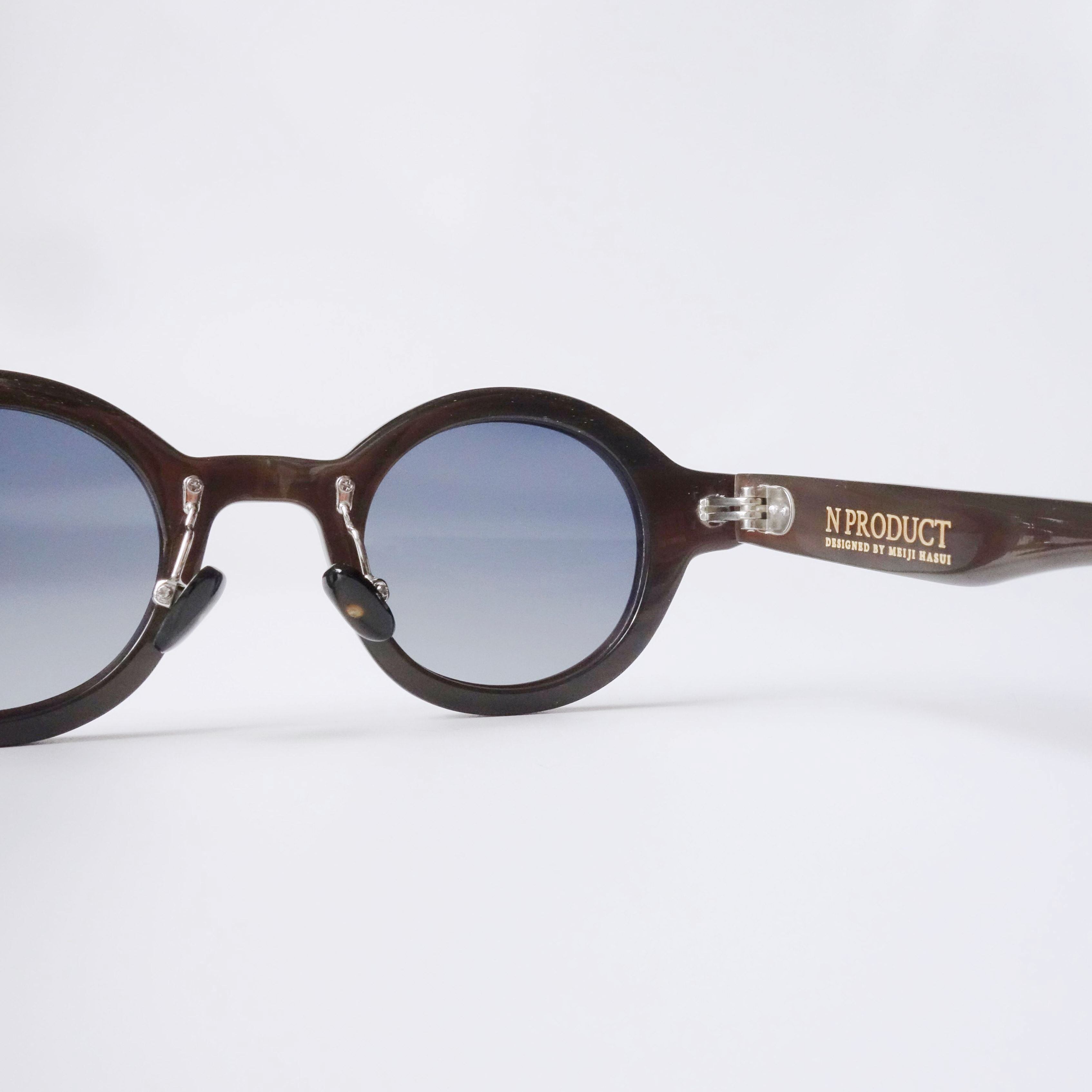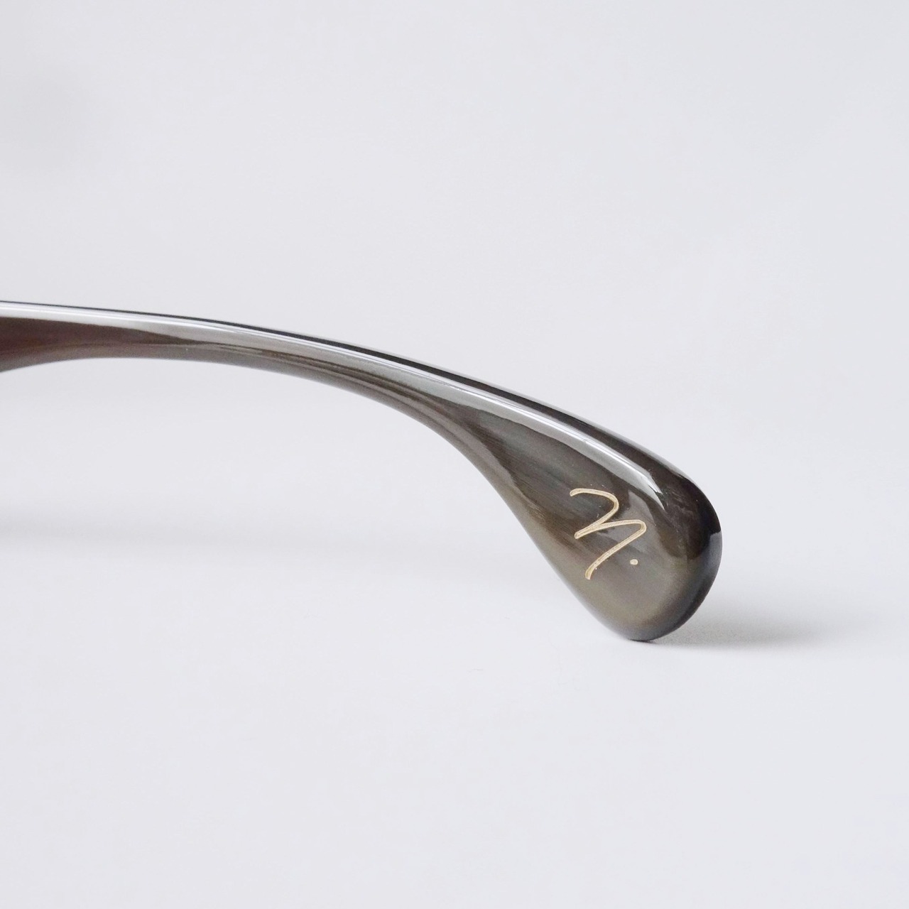 エヌプロダクトは水牛の角(バッファローホーン)製の眼鏡ブランドです。バッファローホーンは黒茶白のセピア調の色味で構成されており、それらの色が油絵のように重なり様々な表情を生み出します。バッファローホーンの先端部分はダッフルコートのボタンやピアス・アクセサリー等に加工されます。私達は眼鏡ブランドとしてのノウハウを活かし、厚みのある根元の部分を採用しアイウェアを製作しました。