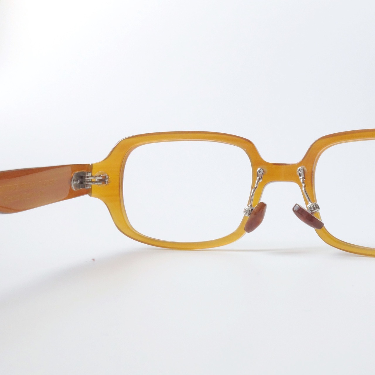 アセテート用のウォーマーで長めに温めていただく事で曲げ伸ばし等の調整も可能です。フロントもテンプルも横に繊維方向があります。テンプルは繊維方向に逆らって縦に鋭角に曲げてしまうと破損の原因になります。繊維方向に沿って内寄せする曲げには強いので、スポーツサングラスのように抱き込むフィッティングが望ましいです。鼻あてやテンプル開き・高さの調整が必要な箇所には、金属パーツを採用しております。